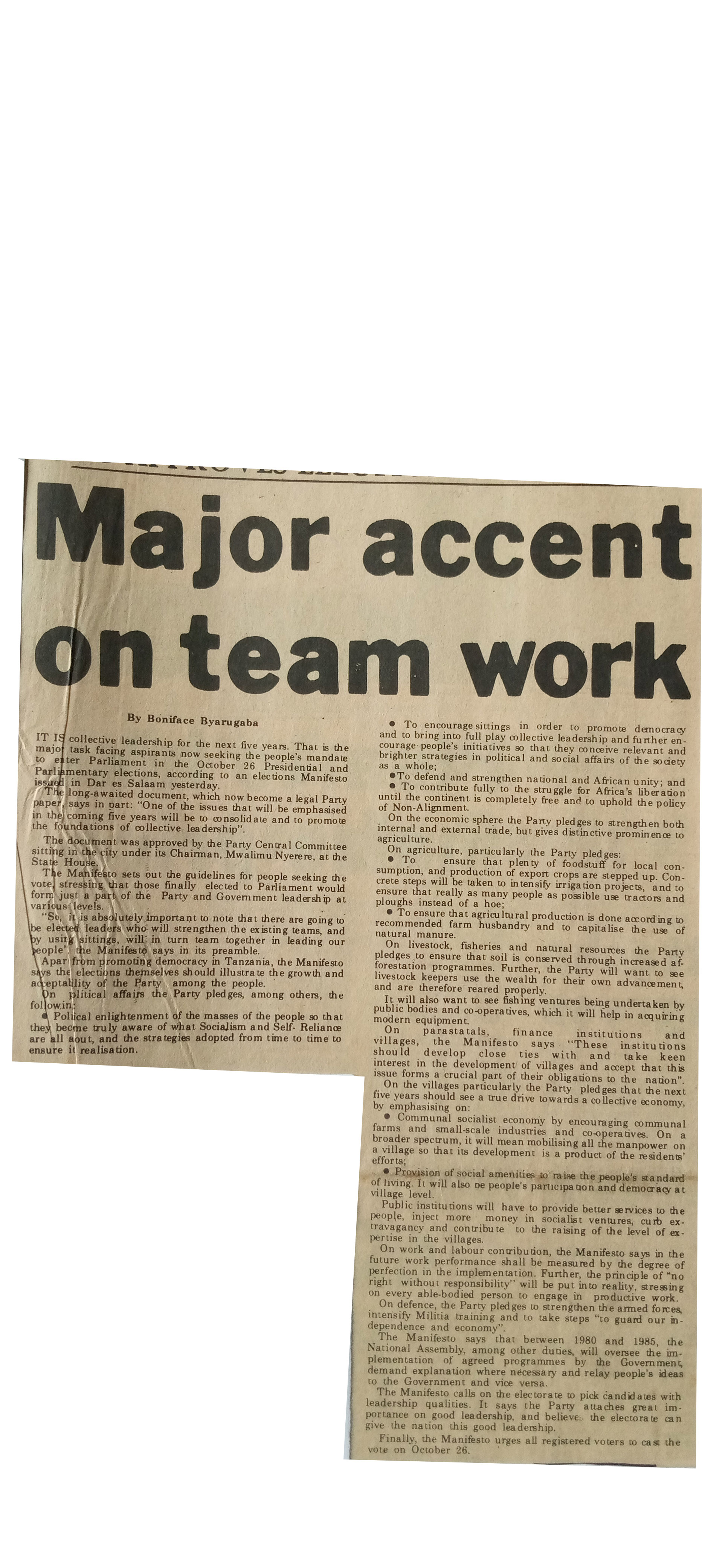 It is collective leadership for the next fiver years That is the major task facing aspirants now seeking the people`s mandate to eater parliament in the October 26 presidentioal and parlamentry elections according to an elections Manfesto issued in Dar es salaam yesterday.