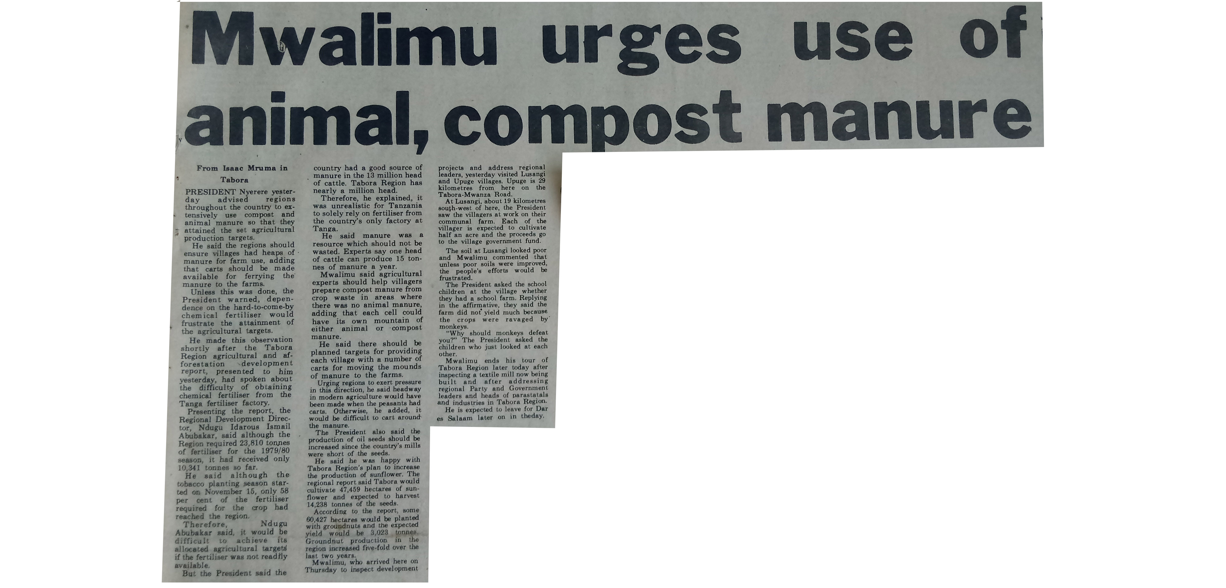 | dc.description.abstract | President Nyerere yester day advised regions throughout the country to extensively use compost and animal manure so that they attained the set agricultural production targets. | en_US |