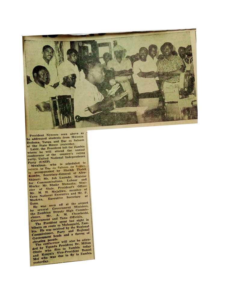 President Nyerere addressed students from Mwanza, Dodoma, Tanga and Dar es Salaam at the state house.