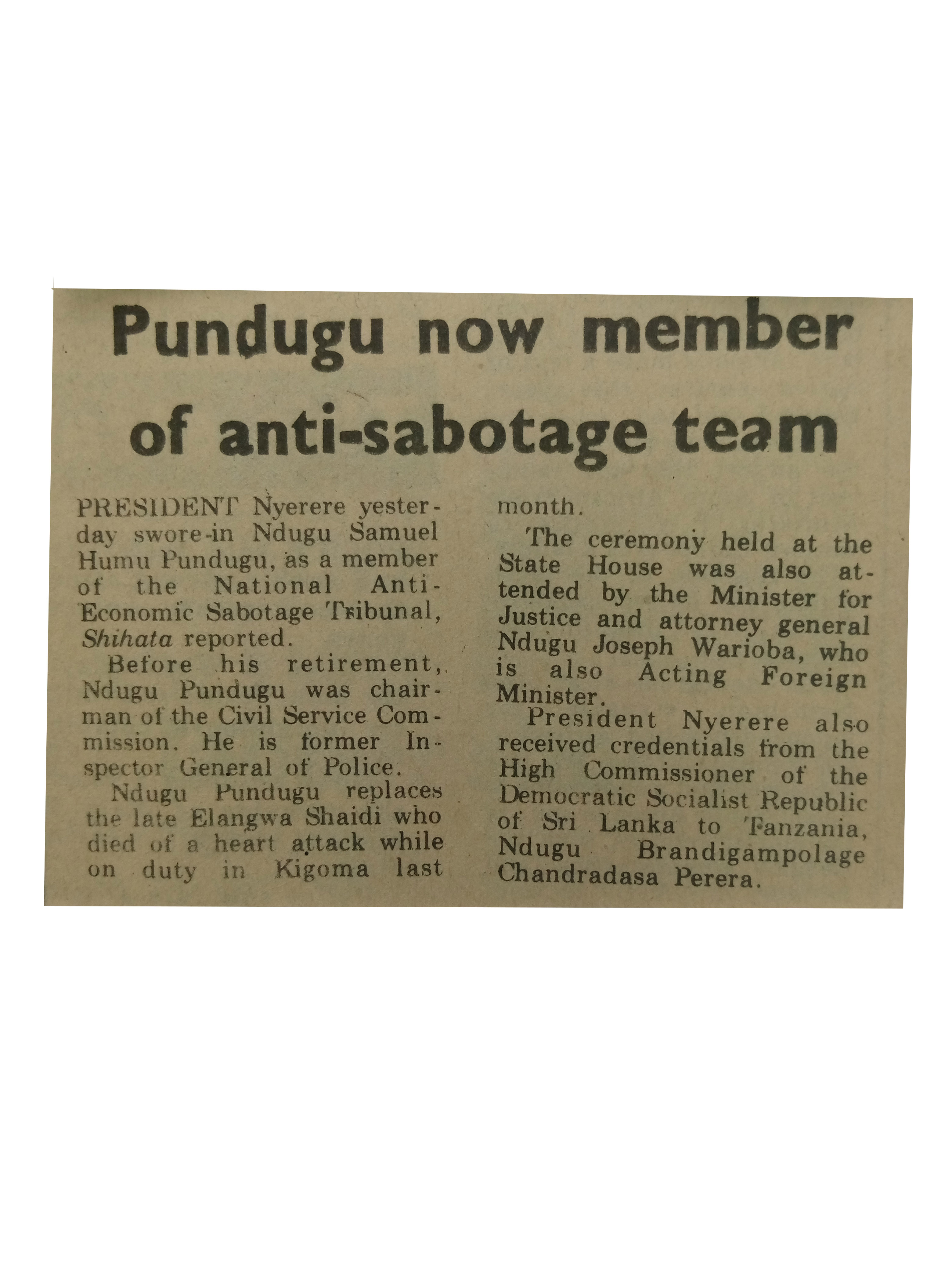 President Nyerere yesterday swore-in Ndugu Samuel Humu Pundugu,as a member of the National Anti-Economic Sabotage Tribunal,Shihata reported.