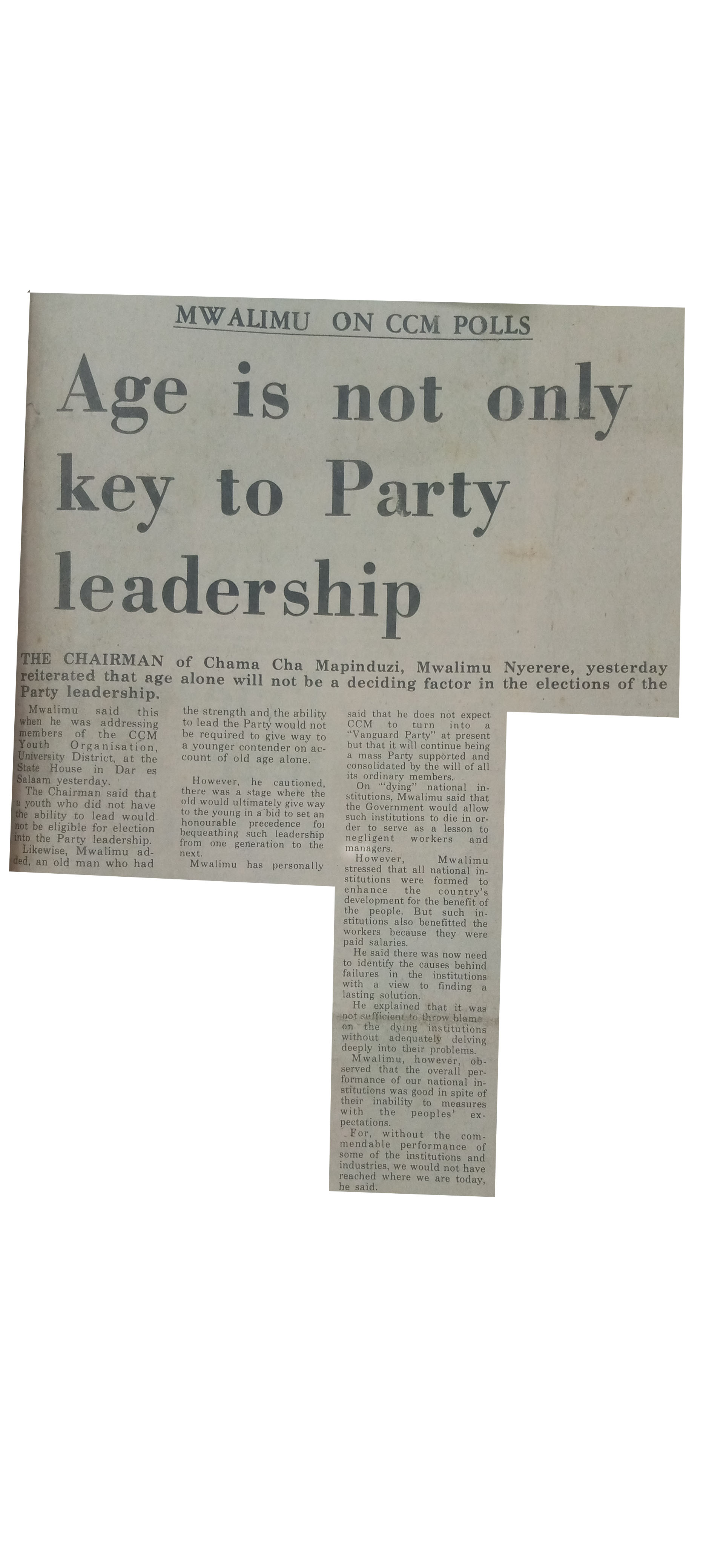 Mwalimu on CCM polls: Age is not only key to party leadership (1977, July 29). Daily News, pp1.
