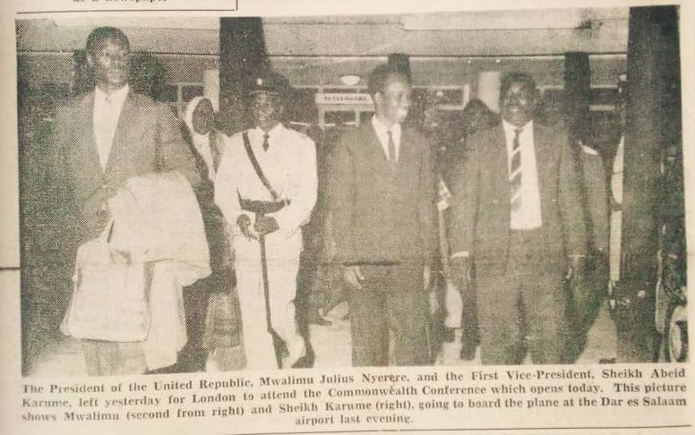 The president of the United Republic Mwalimu Julius Nyerere and the First Vice-President sheih kh Abeid Karume left to attend the commonwealth conference