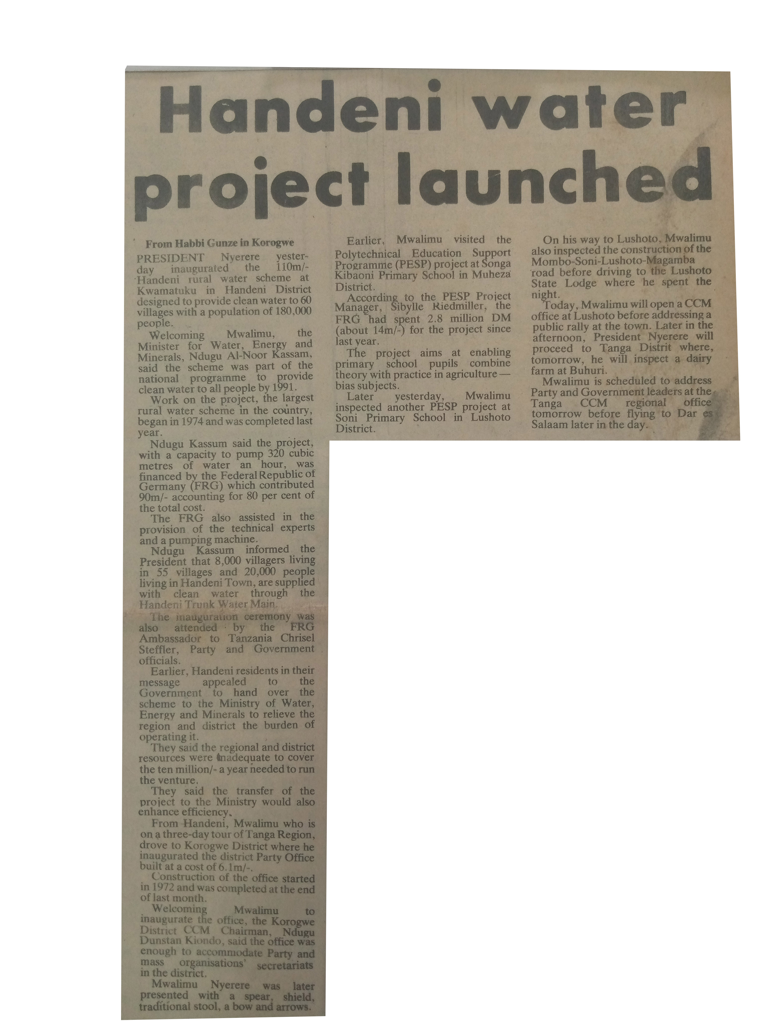Handeni water project launched(1985,May 3) Daily News,pp.1