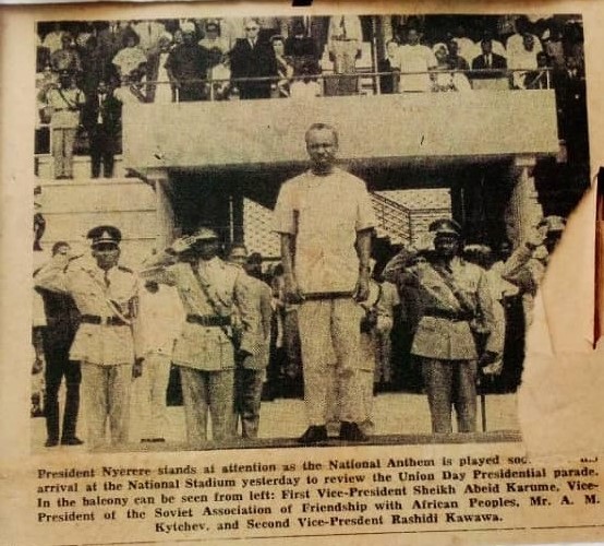 President Nyerere stands at attention as National Anthem (1967), The Nationalist.pp.1