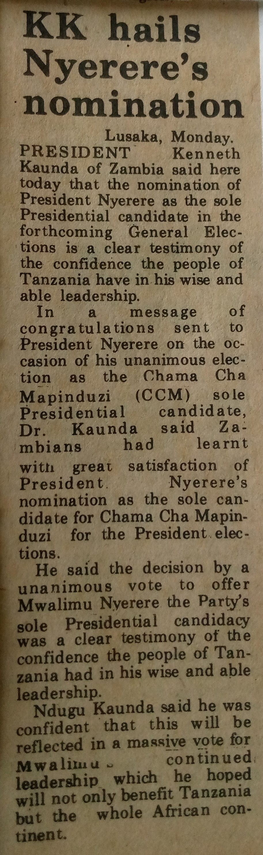 KK hails Nyerere's nomination