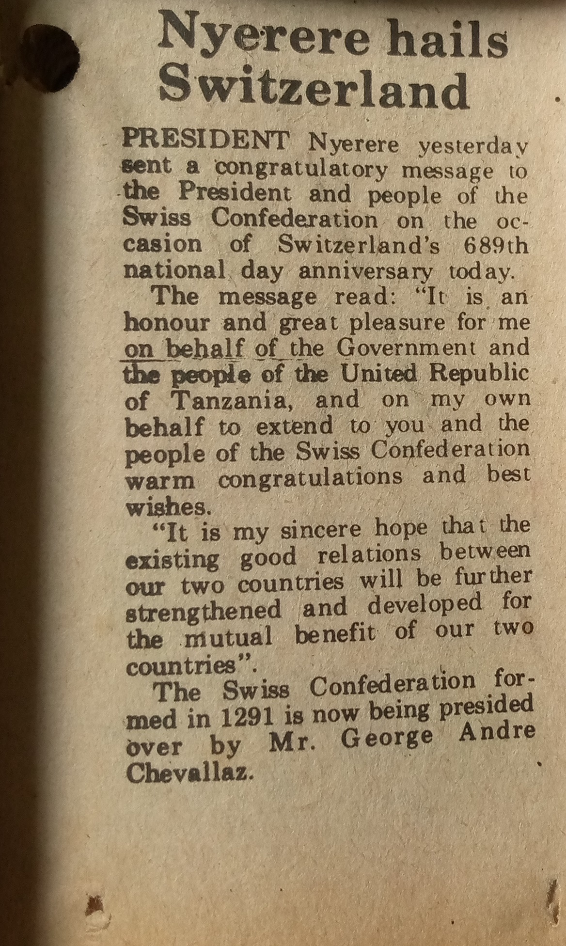 Nyerere hails Switzerland (1980 ,August 1) Daily News,pp.1