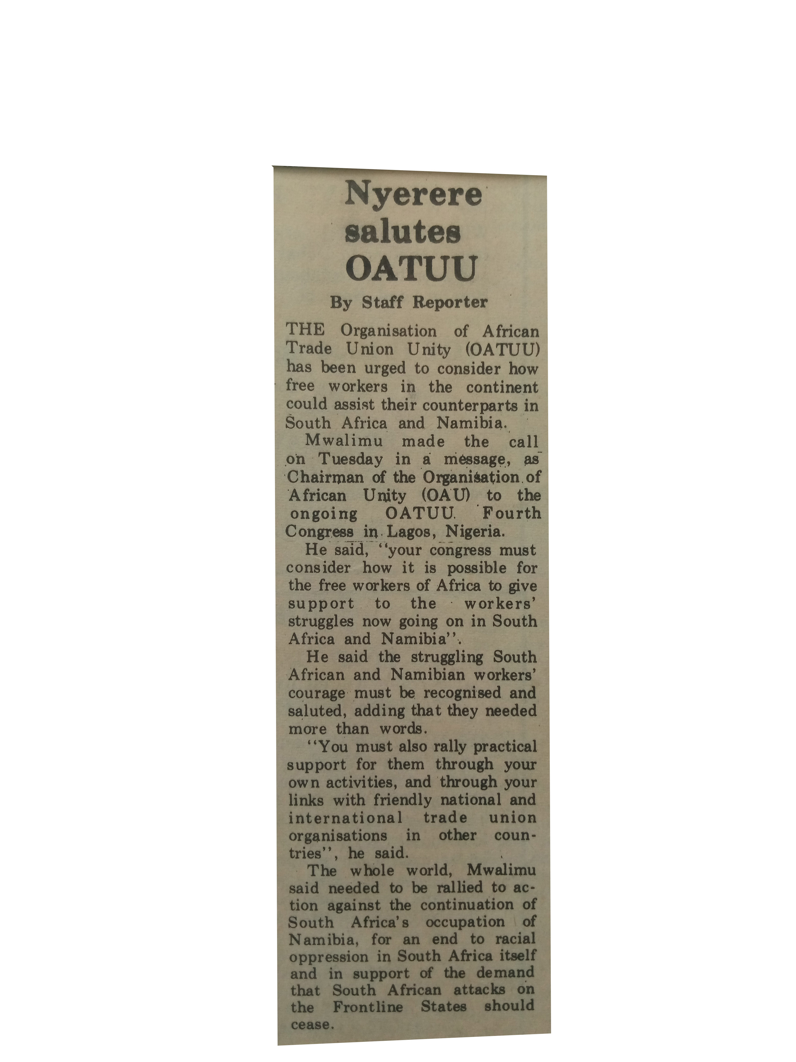 Nyerere salutes OATUU (1985, January 24). Daily News, pp.1