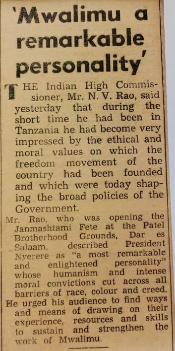 The Indian Commissioner, Mr. N. V. Rao said that, during the short time he had been in Tanzania he dad become very impressed by the ethical and moral values on which the freedom movement of the country had been founded and which were today shaping the broad policies of the Government.