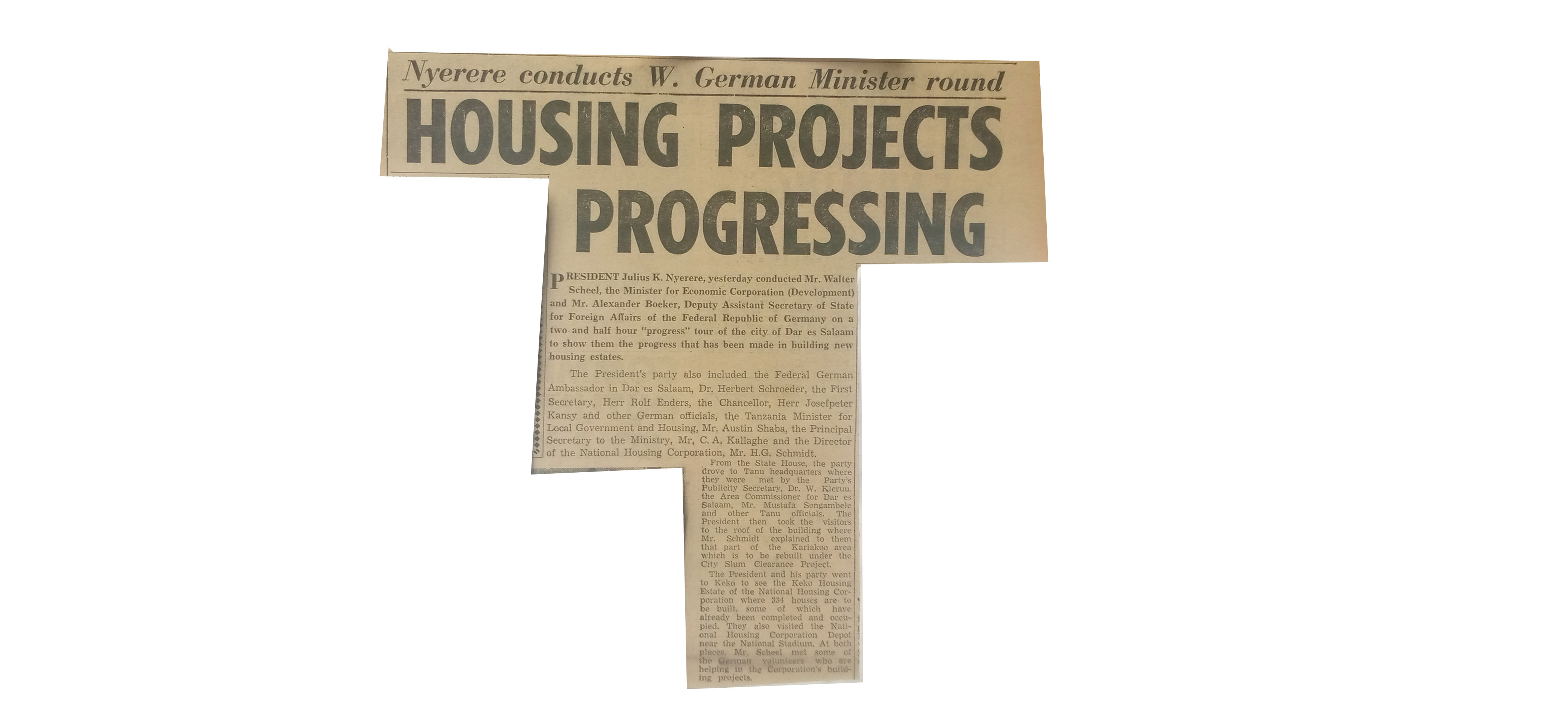President Julius K.Nyerere,yesterday conducted Mr.Walter Scheel,the Minister for Economic Corporation and Mr.Alexander Boeker,Deputy Assistant Secretary of State for Foreign Affairs of the Federal Republic of Germany on a two and half hour "progress" tour of the city of Dar es Salaam to show them the Progress that has been made in building new housing estates.