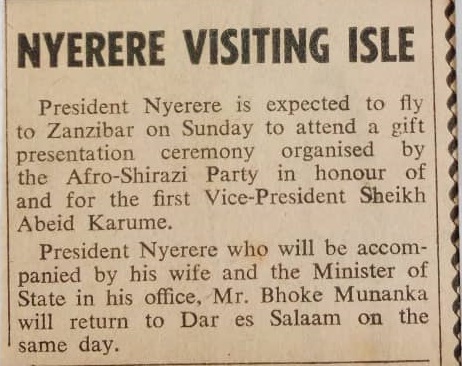 President Nyerere is expected to fly to Zanzibar to attend a gift presentation ceremony organizedby the Afro-Shirazi