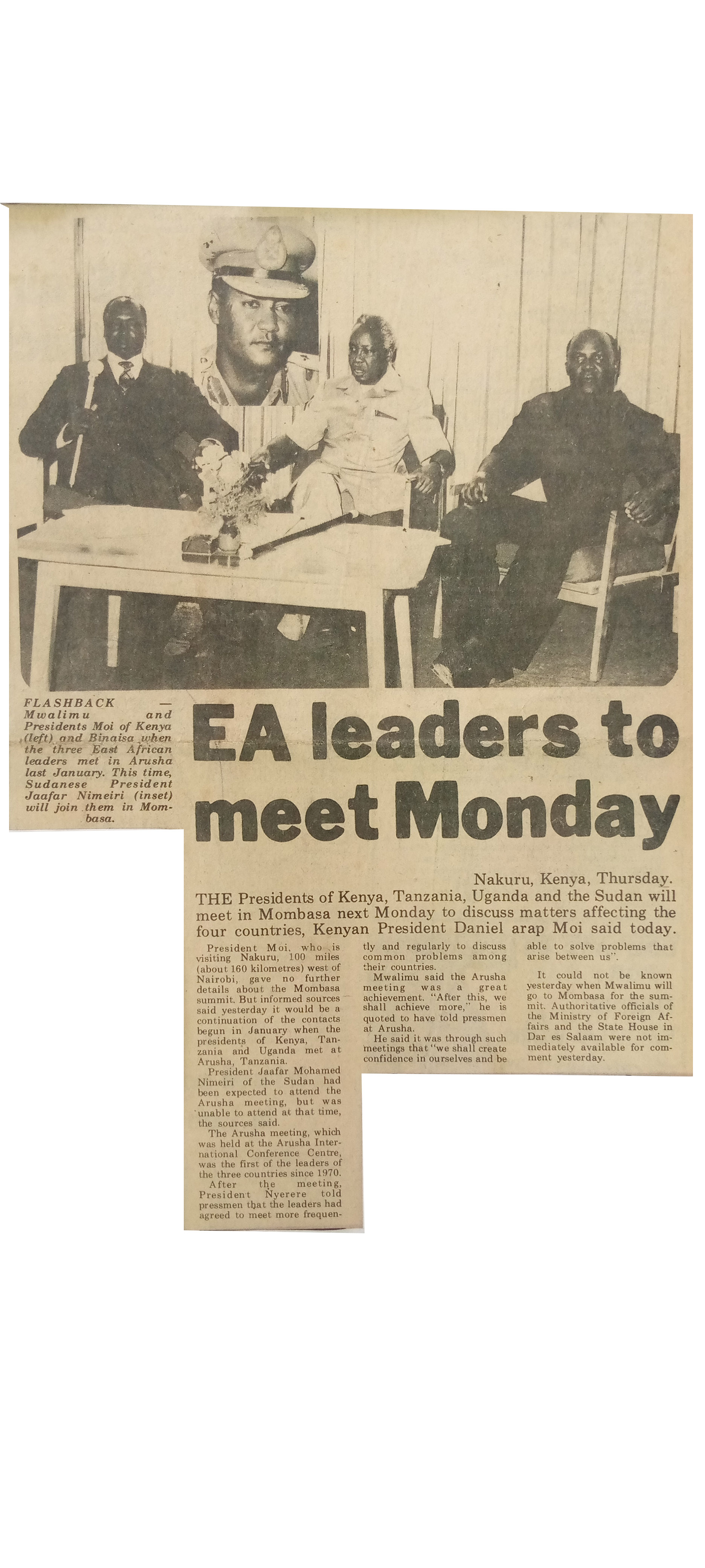 Mwalimu, Presidents Moi, Kenya, Binaisa, East African leaders, Arusha, . Sudanese President, Jaafar Nimeiri, Mombosa