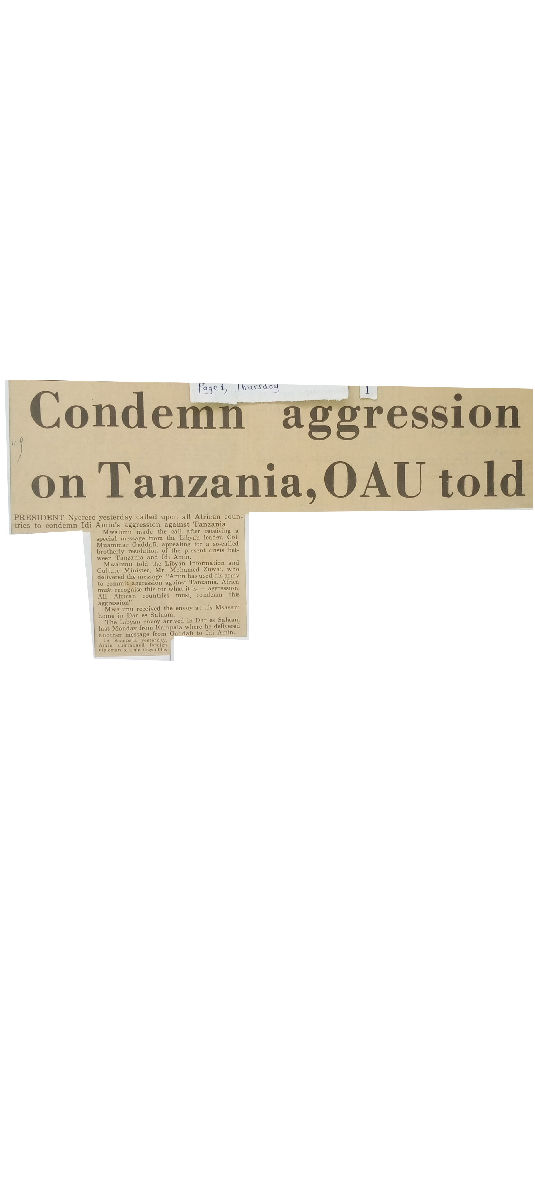 Condemn aggression on Tanzania,OAU told (1978,November 9) Daily News.pp.1