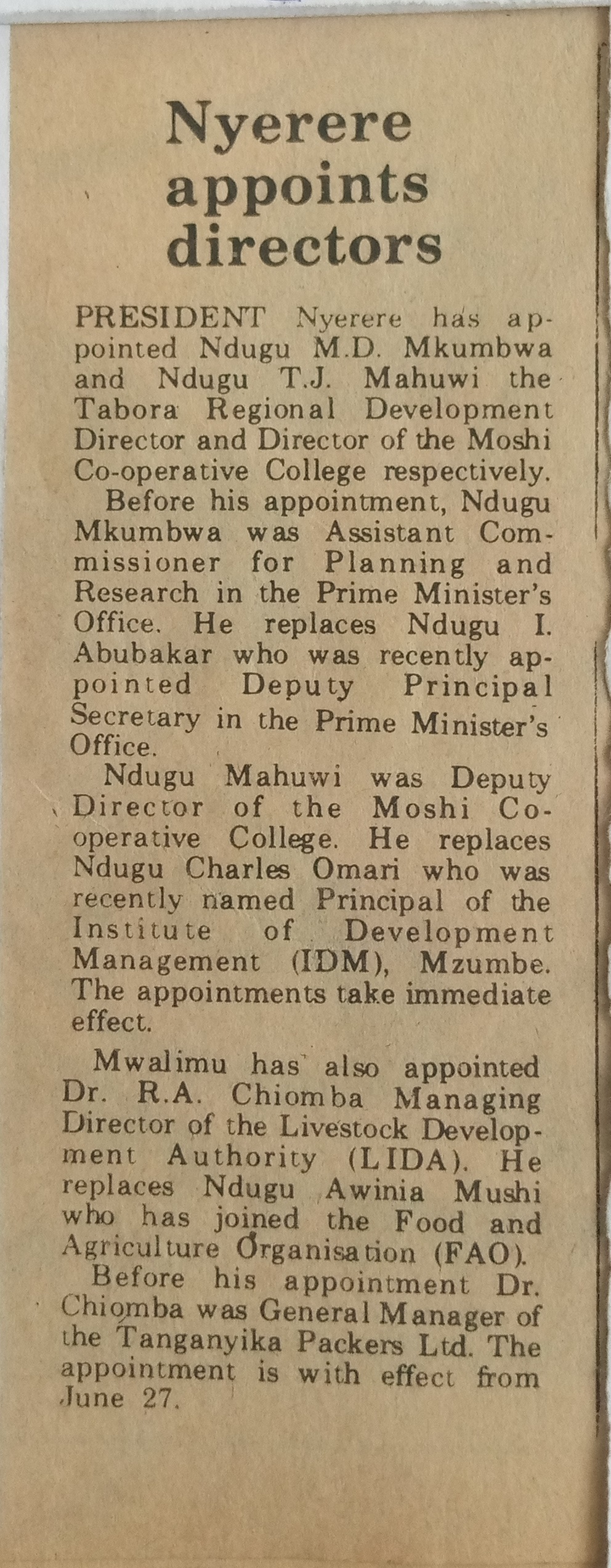 President Nyerere has appointed Ndugu M.D Mkumbwa and Ndugu T.J.Mahuwi the Tabora Regional Development Directors and Director of the Moshi Co-operative College respectively.