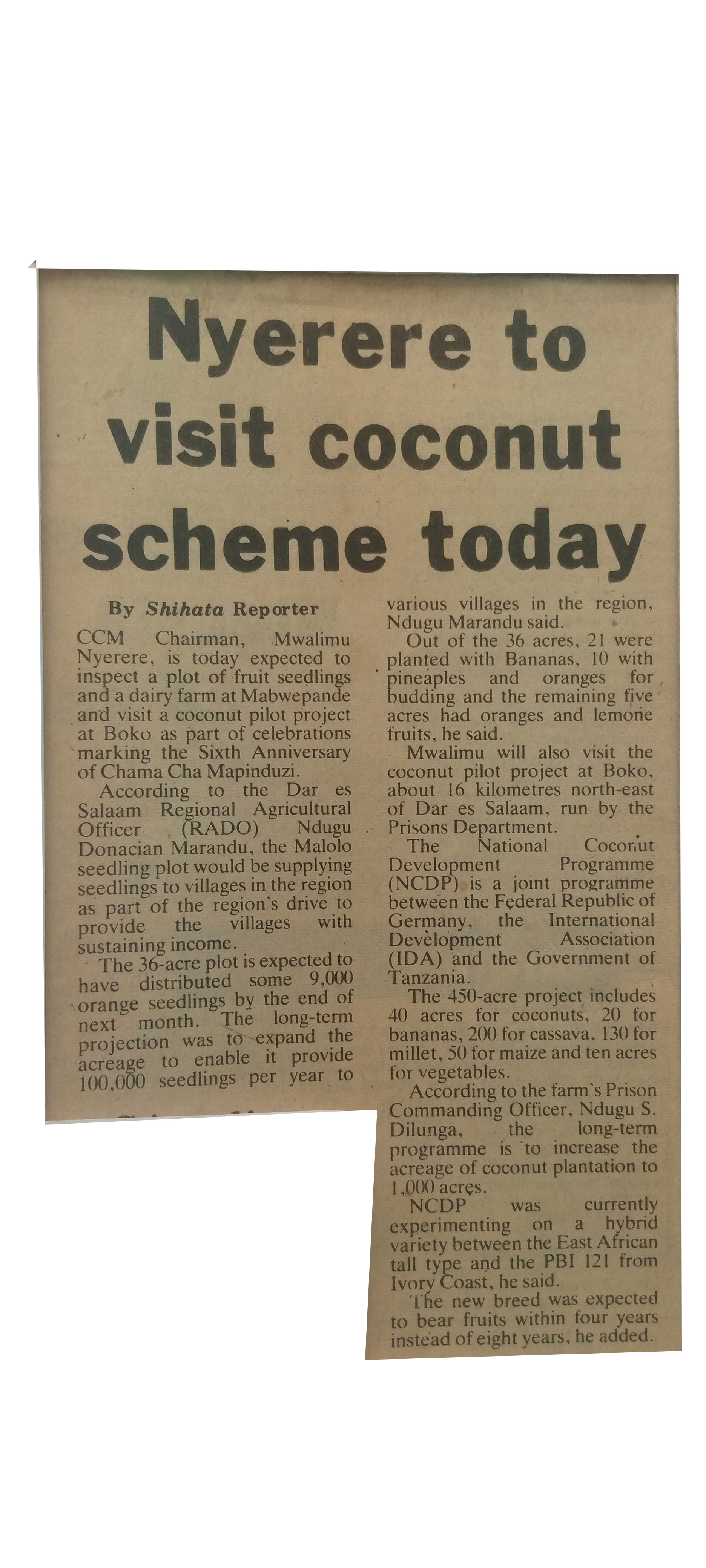 Nyerere to visit coconut scheme today (1983, February 4) Daily News, pp.1