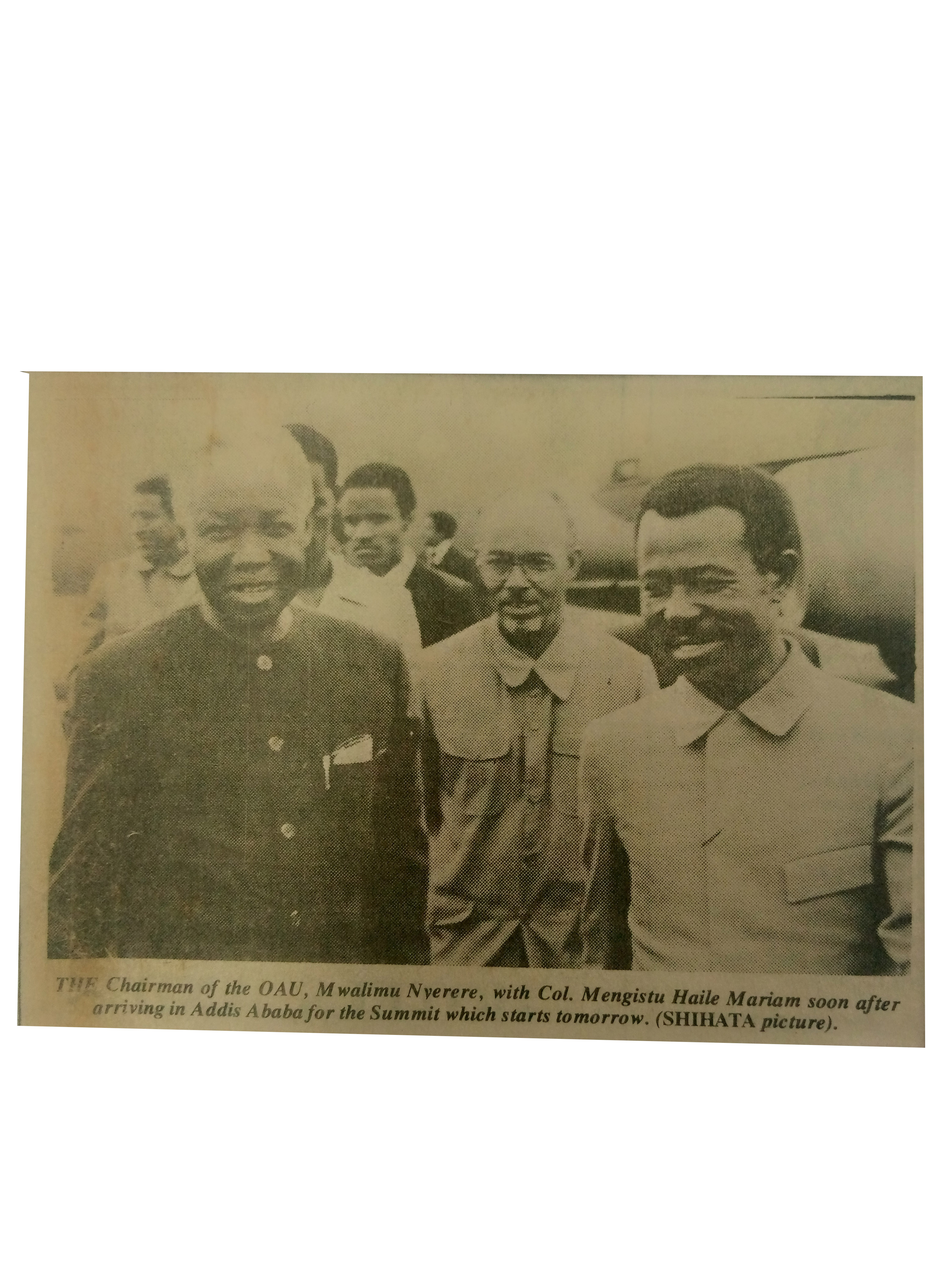 The Chairman of the OAU, mwalimu Nyerere, with Col. Mengistu Haile Mariam soon after arriving in Addis Ababa for the Summit which starts tomorrow