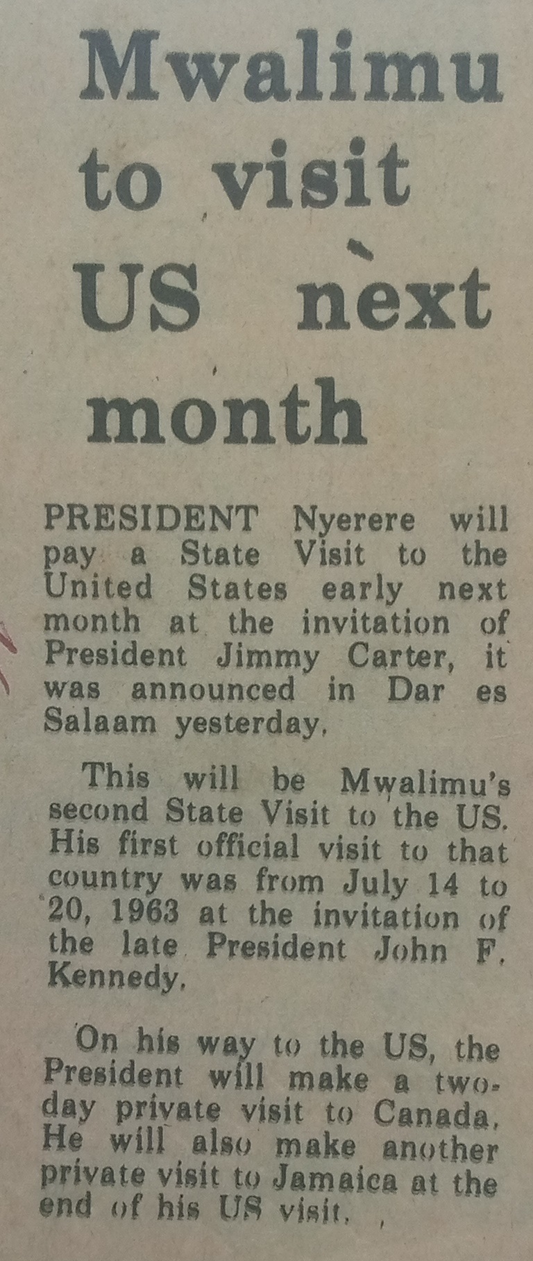 Nyerere, J.K. (1977) Mwalimu to vist US next month, Dar es Salaam, Daily News, p1.