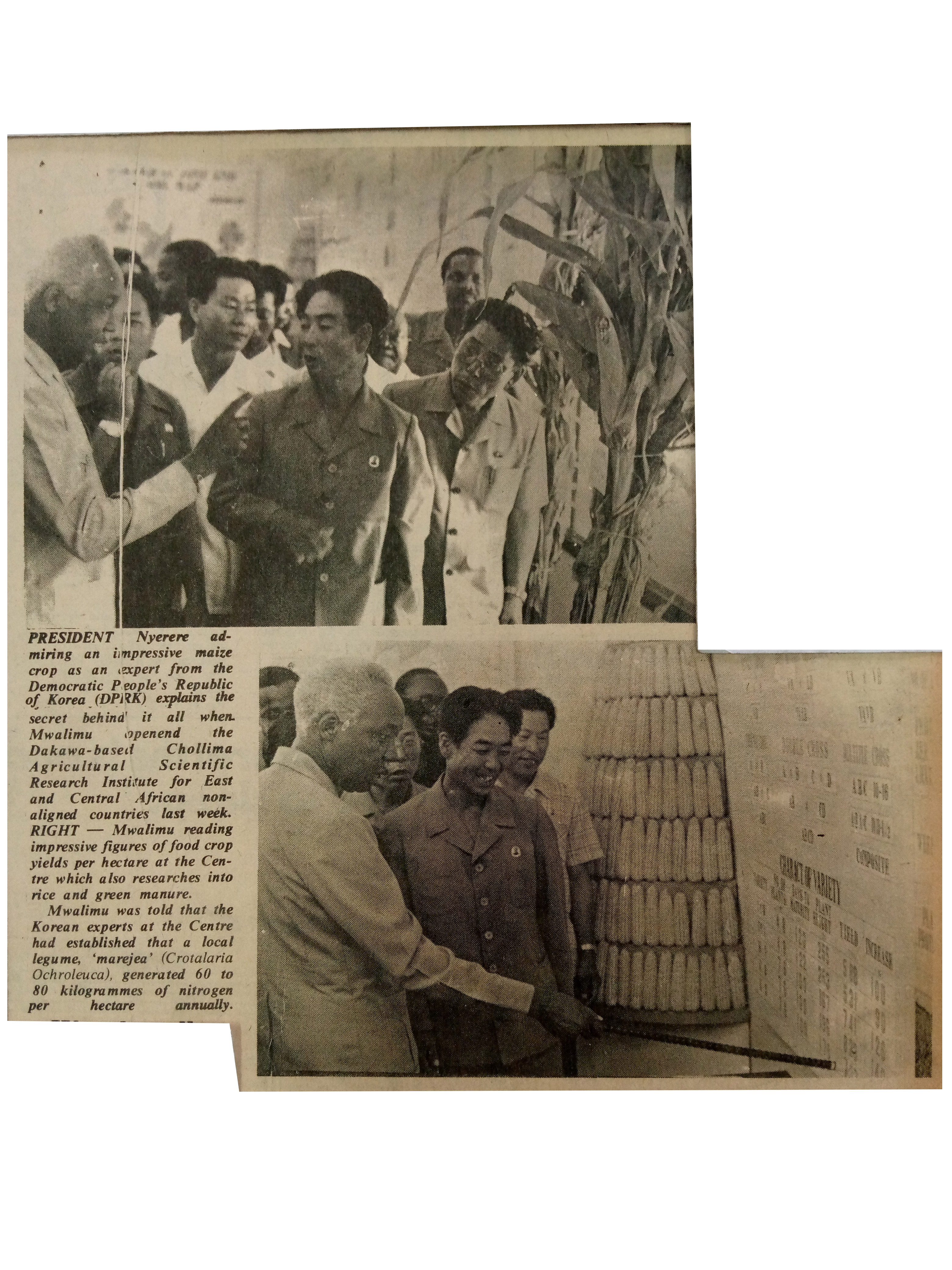 President Nyerere admiring an impressive maize crop as an expert from the Democratic peoples's Republic of Korea