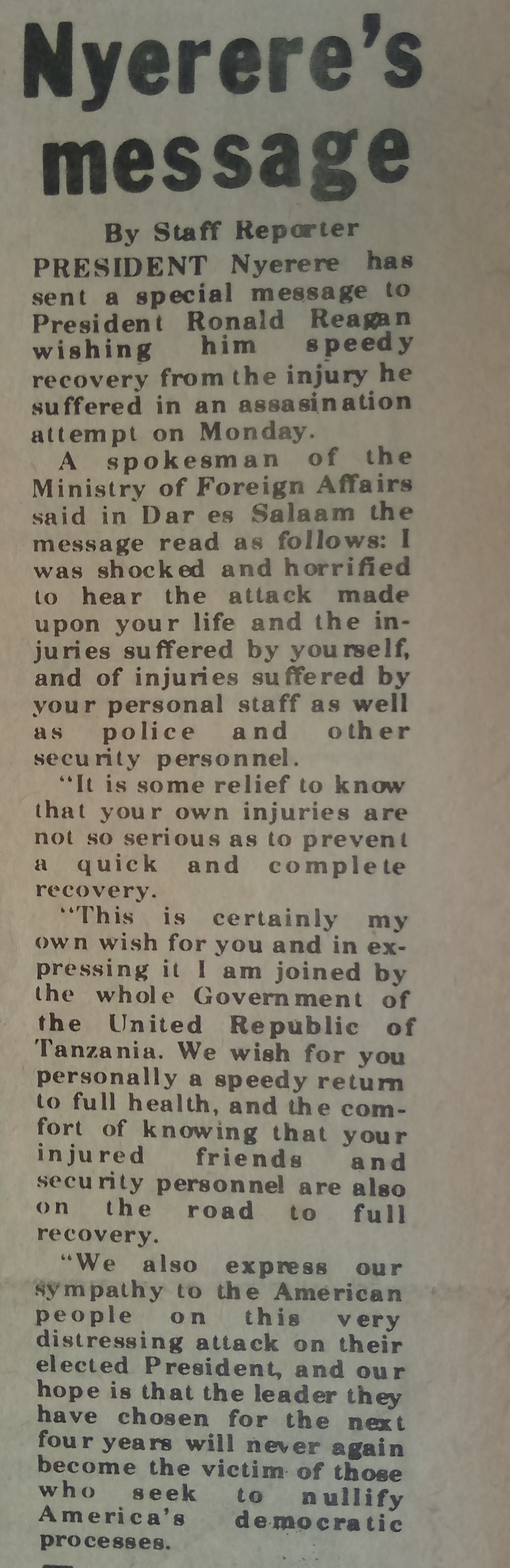 President Nyerere sent a condolence message to the Vice-President of the socialist Republic of Vietnam, Ndugu Nguyen Huu Tho, following the untimely death of President of Vietnam Ndugu Ton Due Thang.