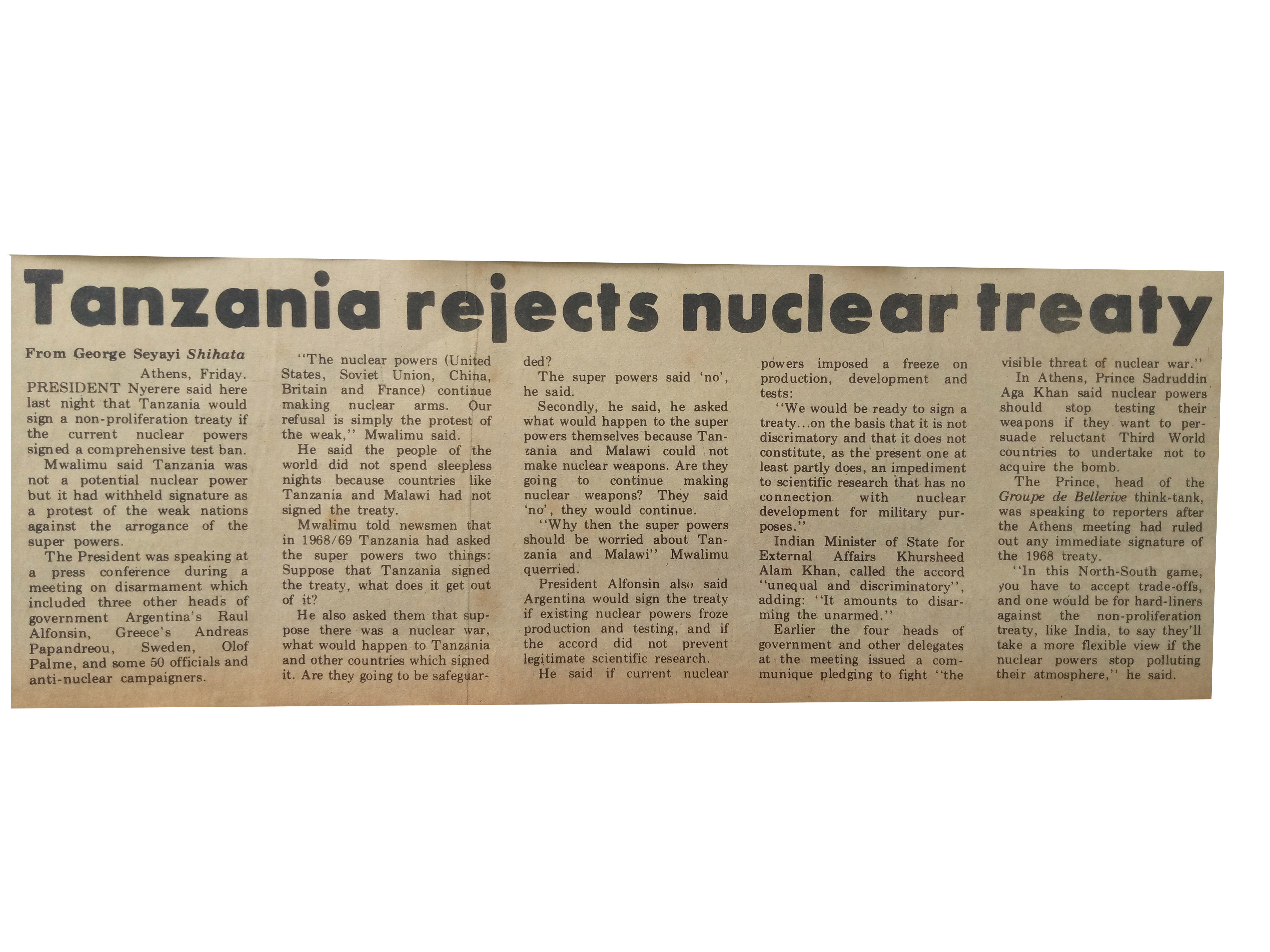 Tanzania rejects nuclear treaty(1985,february 2),Daily News. pp.1