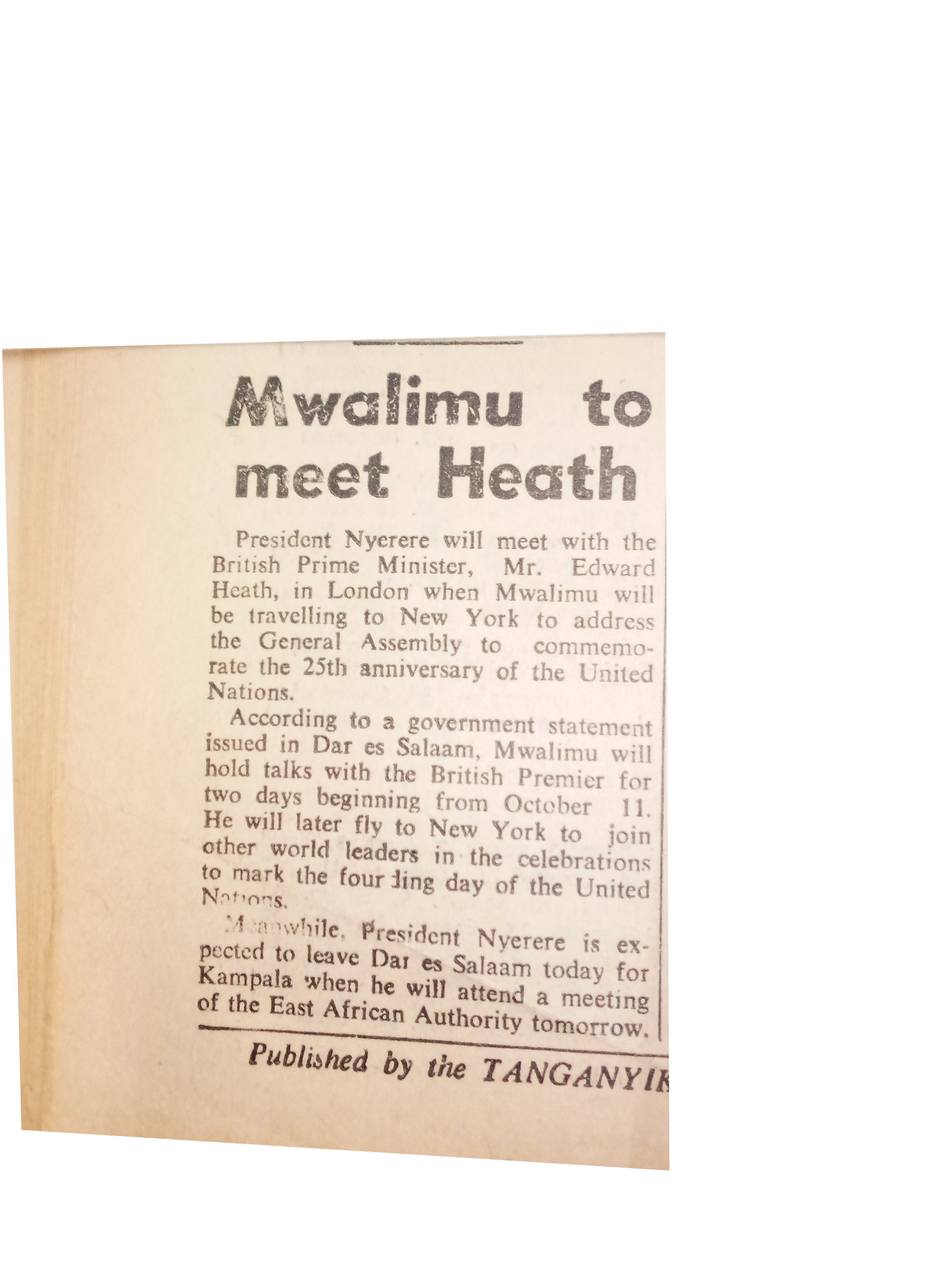 President Nyerere will meet with the British Prime Minister, Mr. Edward Heath in London when Mwalimu will be travelling to New York to commemorate the 25th anniversary of the United Nation