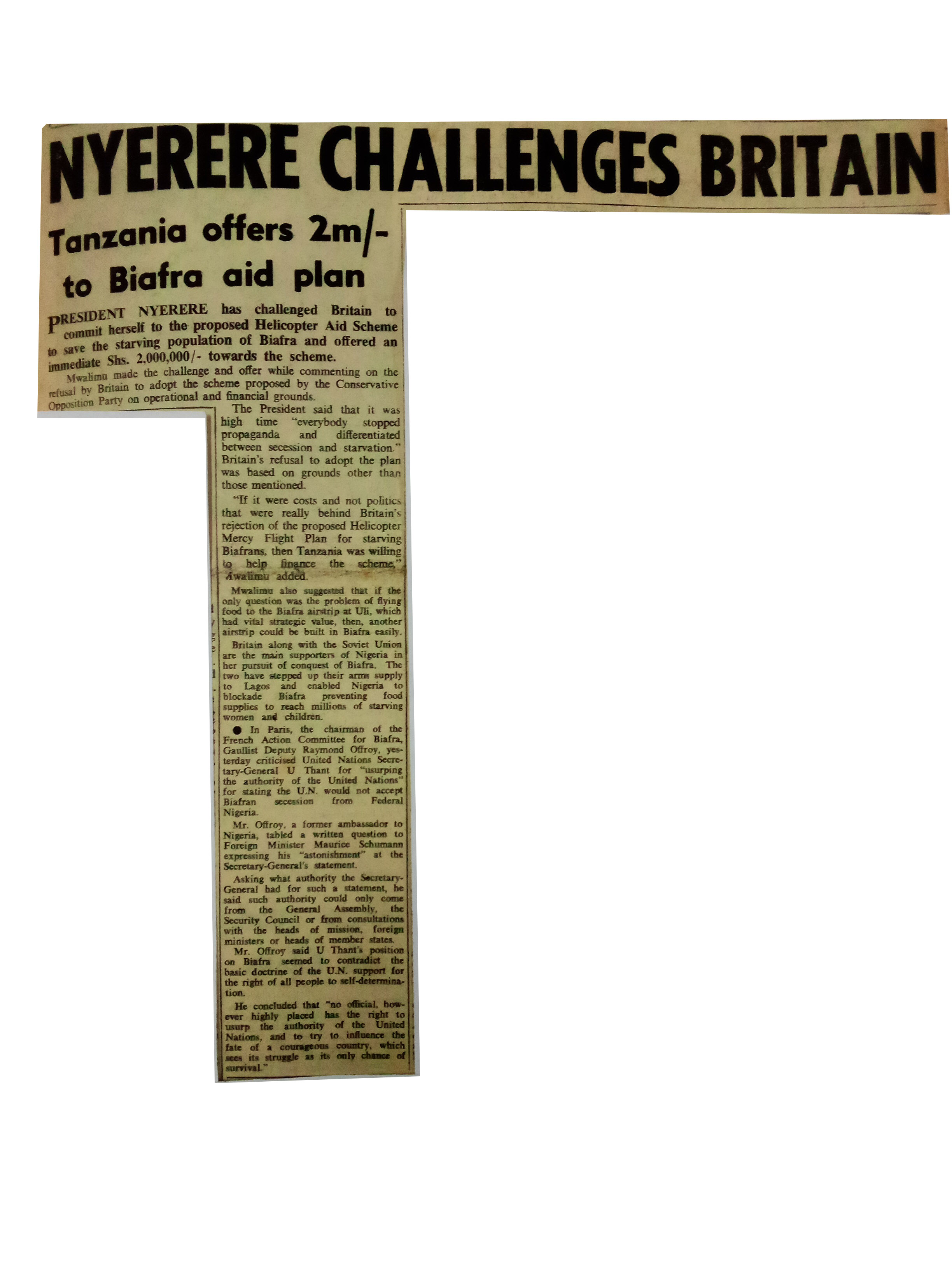 President Nyerere has challenged Britain to commit herself to the proposed Helicopter Aid Scheme to save the starving population of Biafra and offered an immediate shs. 2,000,000/- towards the scheme.