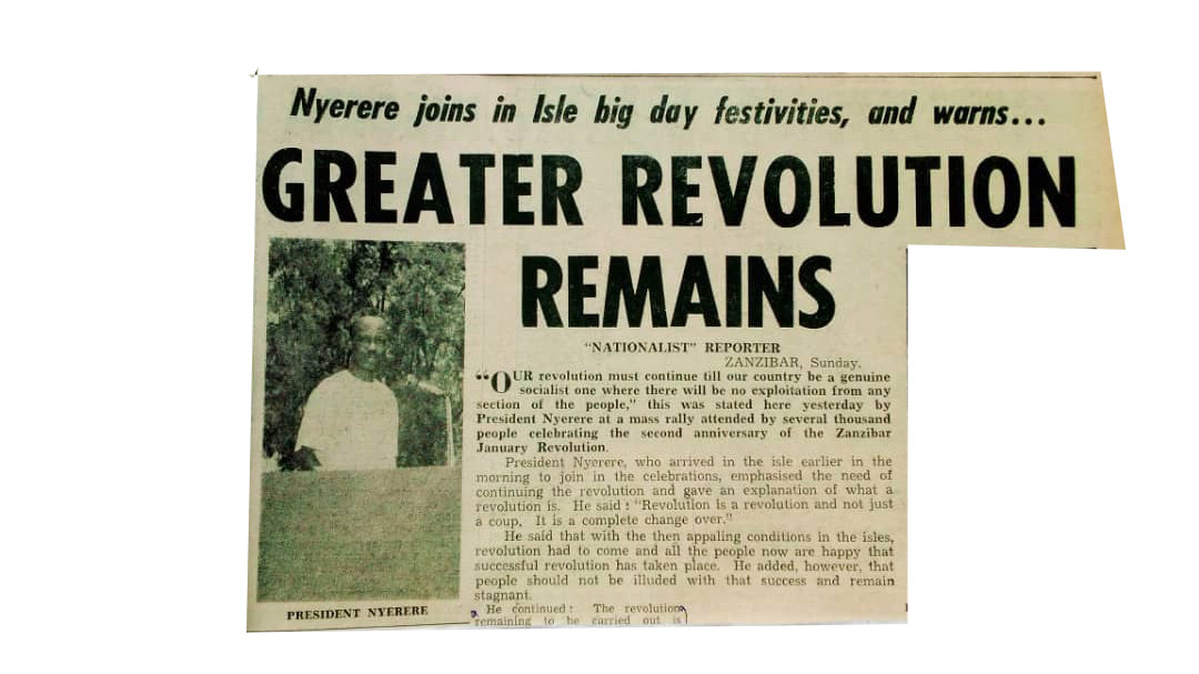 "Our revolution must continue till our country be a genuine socialist one where there will be no exploitation from any section of the people", this was stated by President Nyerere at a mass rally celebrating the second anniversary of the Zanzibar revolution.