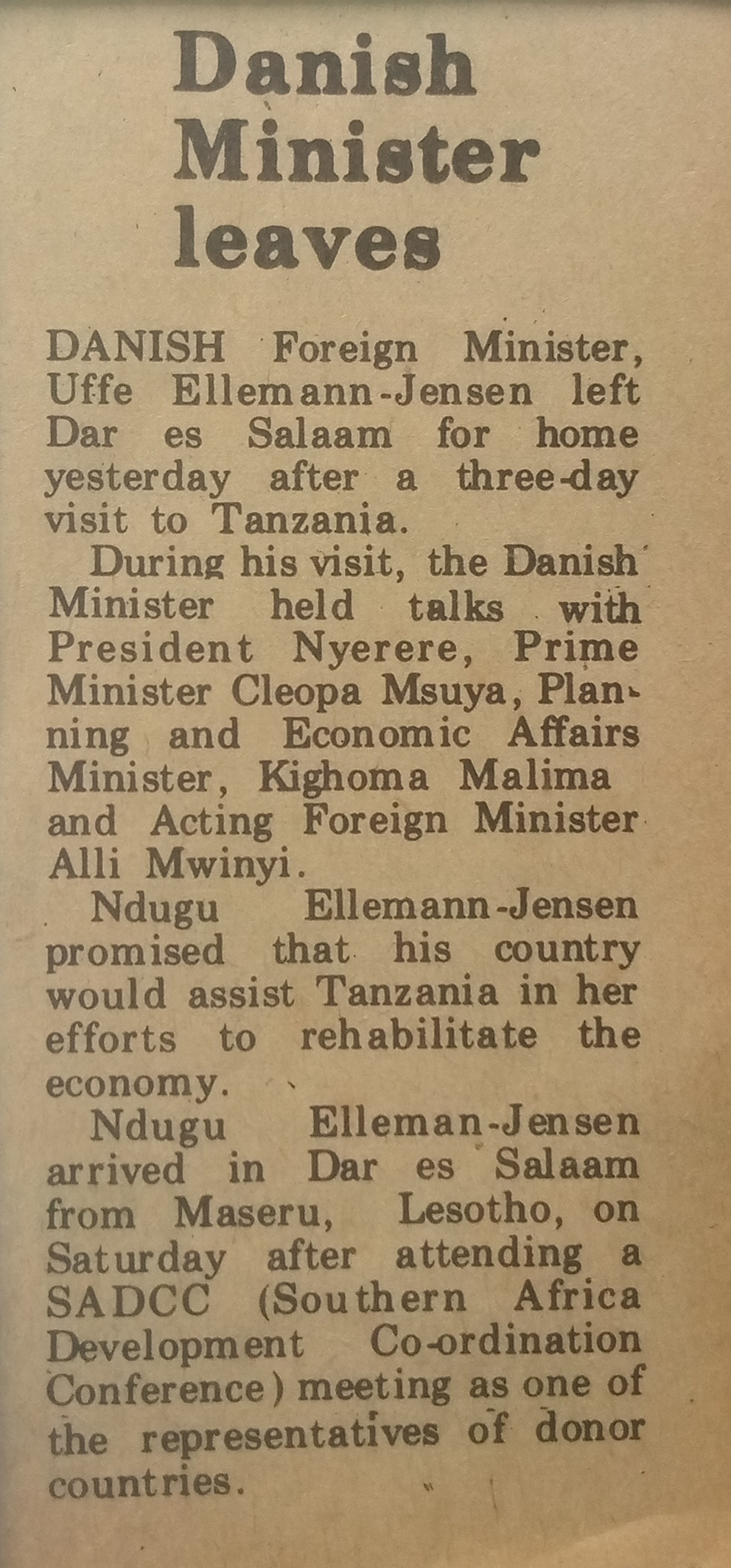 Danish Foreign Minister,Uffe Ellemann-Jensen left Dar es Salaam for home yesterday after a threee-day visit to Tanzania.