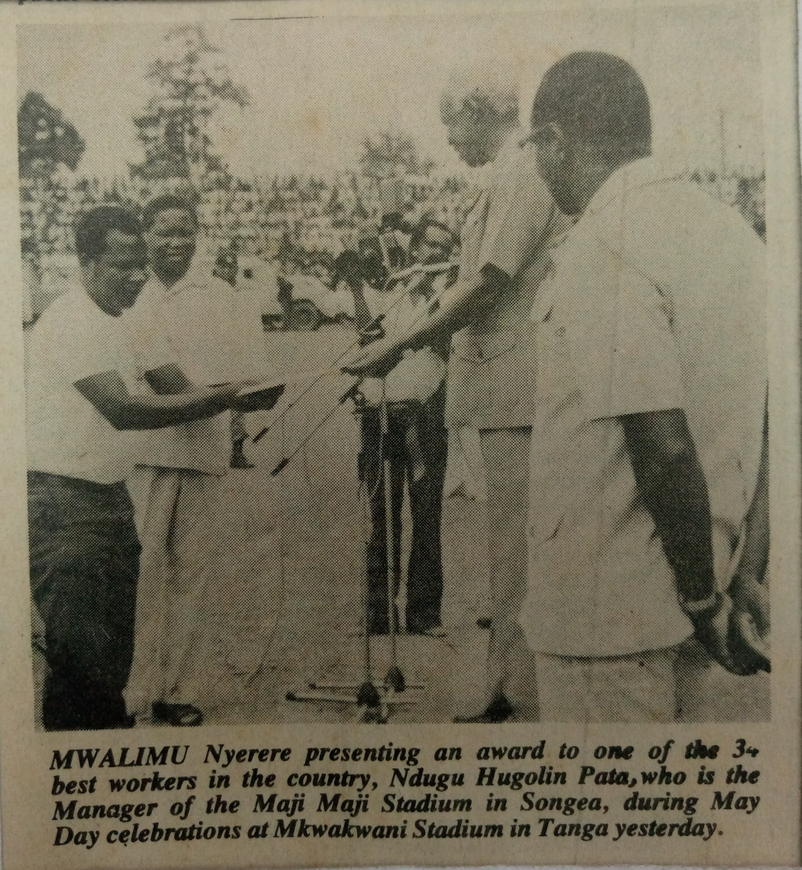 Mwalimu Nyerere presenting an award to one of the 34 best workers in the country, Ndugu Hugolin Pata, who is the manager of the Maji Maji stadium in Songea, during May Day celebrations.