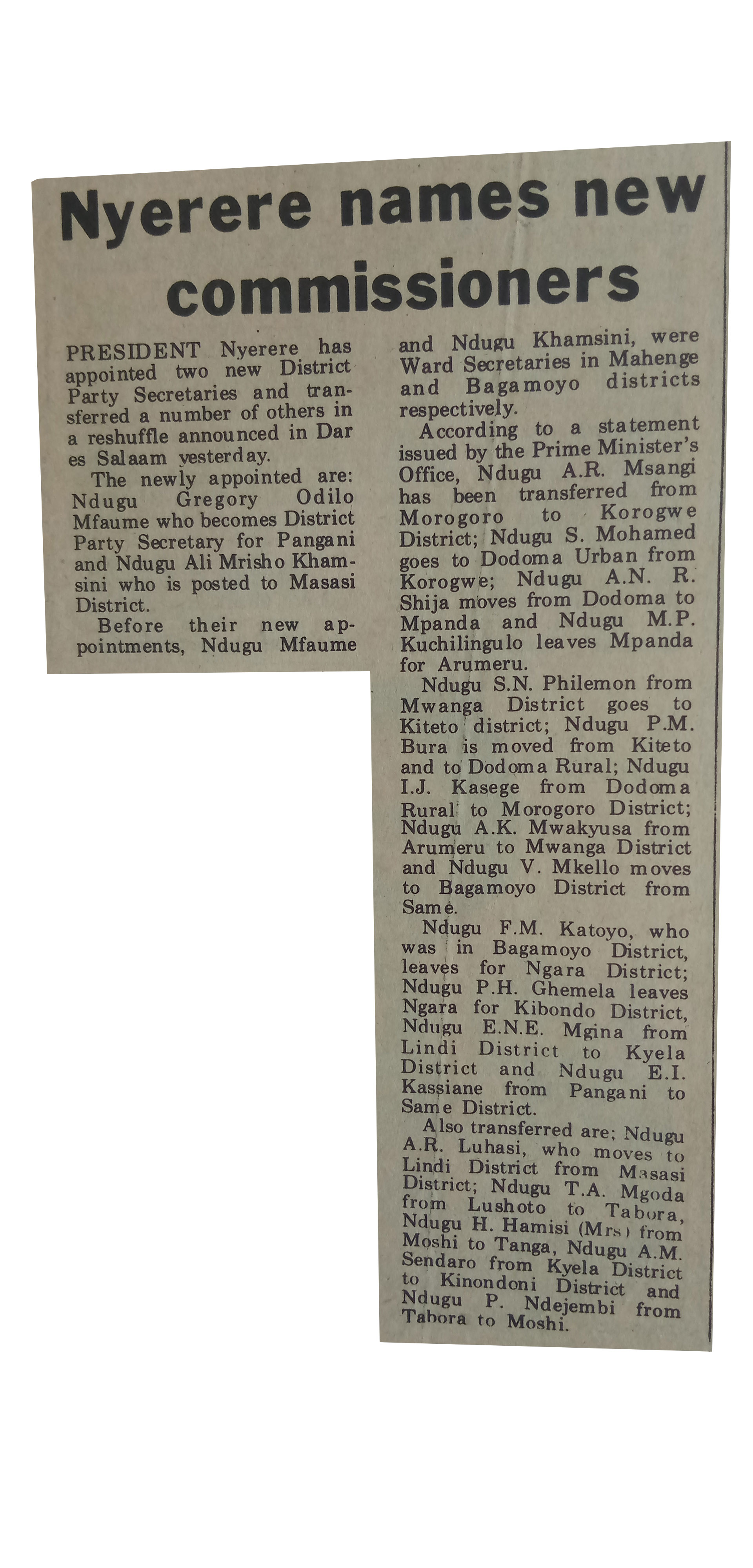 President Nyerere has appointed two new District Party Secretaries and transferred a number of others in a reshuffle announced in Dar es Salaam.