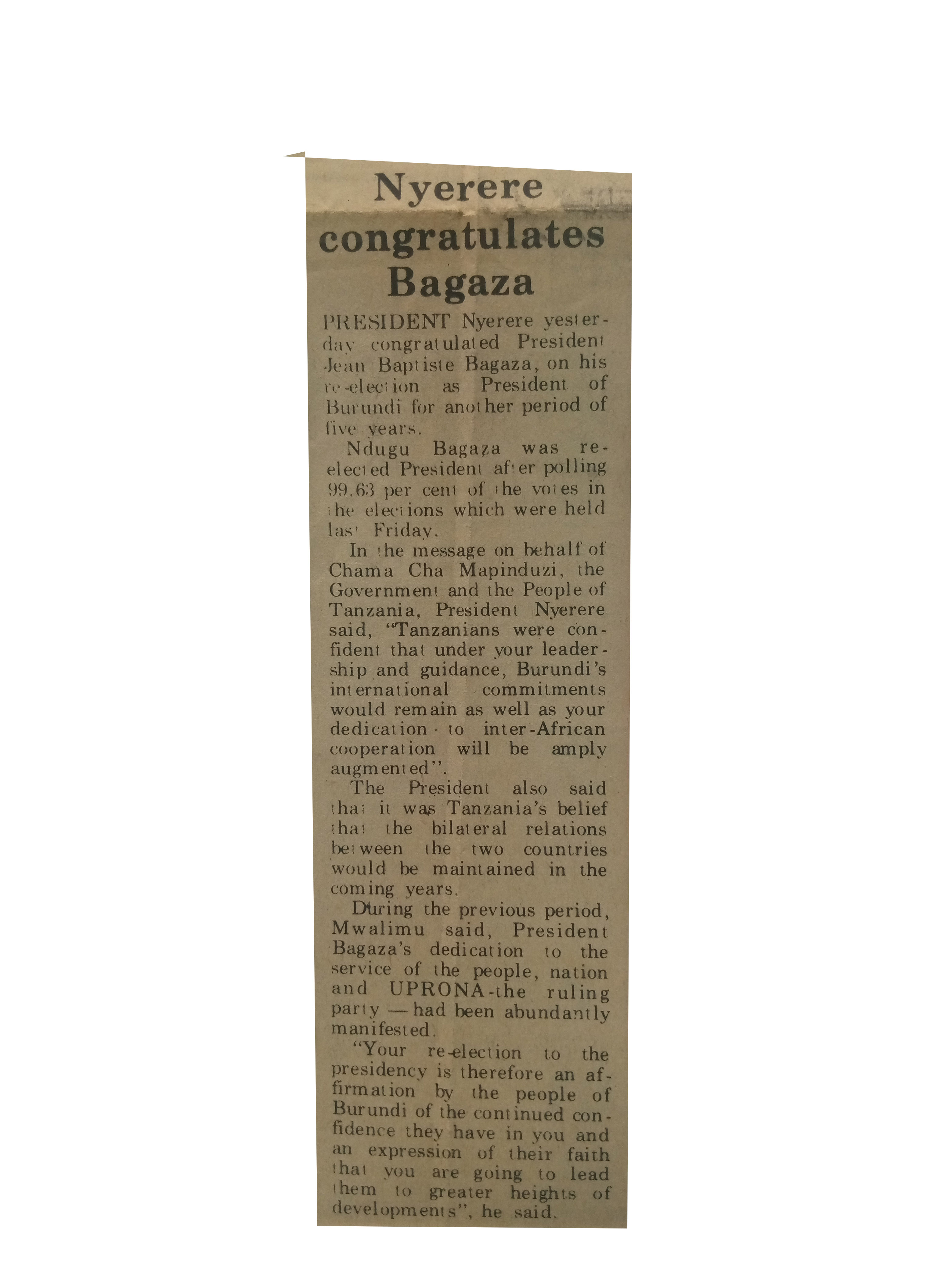 Nyerere congratulates Bagaza (1984,September 5) Daily News.pp.3