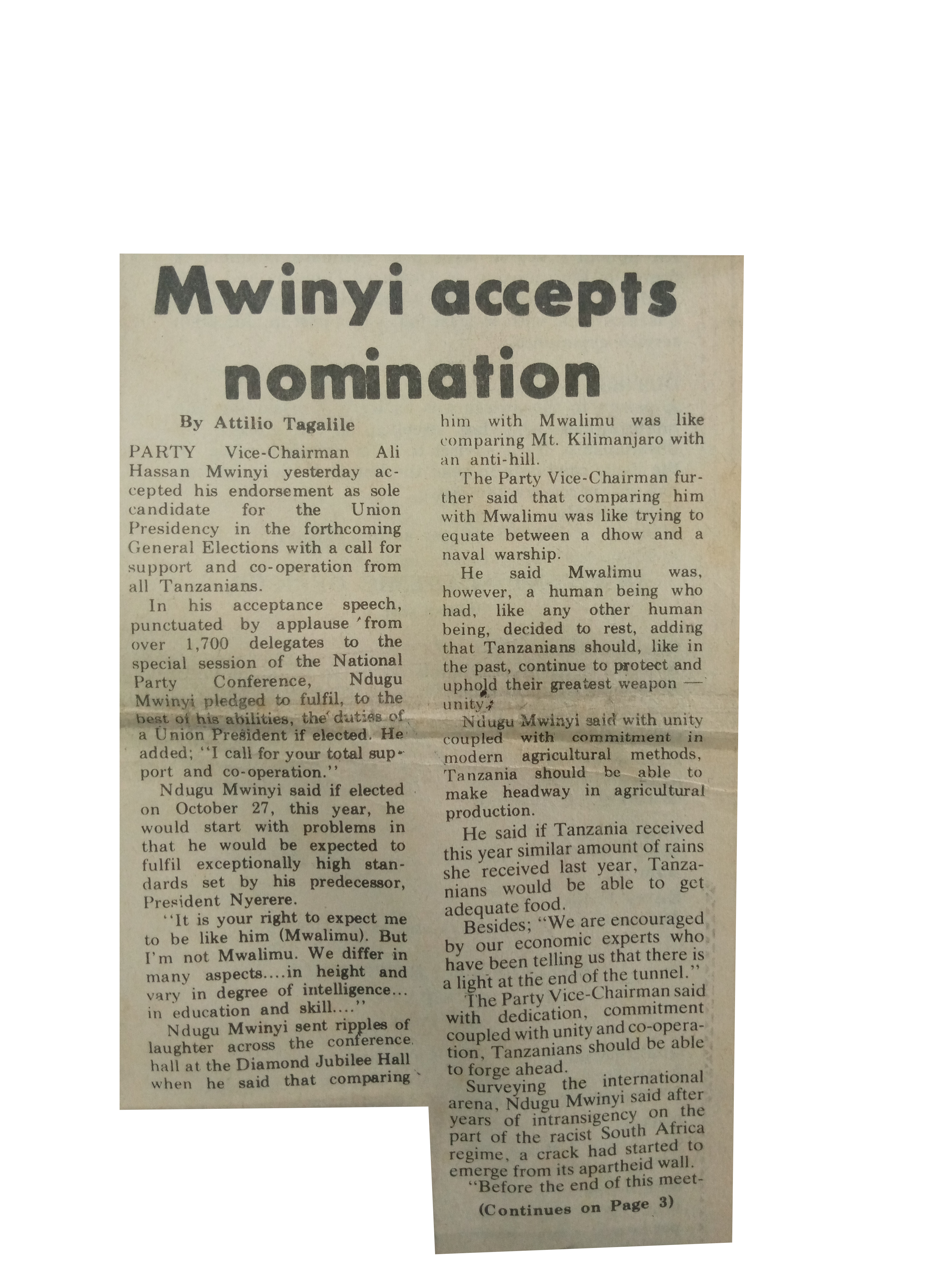 Party Vice-Chairman Ali Hassan Mwinyi yesterday accepted his endorsement as sole candidate for the Union Presidency in the forthcoming General Elections with a call for support and co-operation from all Tanzanians.