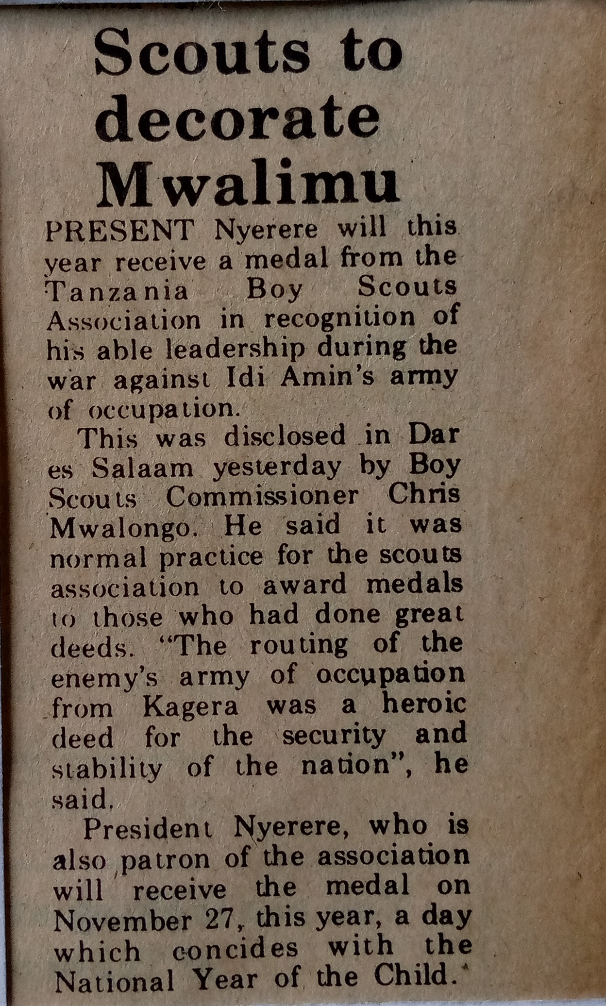 President Nyerere will this year receive a medal from the Tanzania Boy Scouts Association in recognition of his able leadership during the war against Idi Amin's army of occupation.