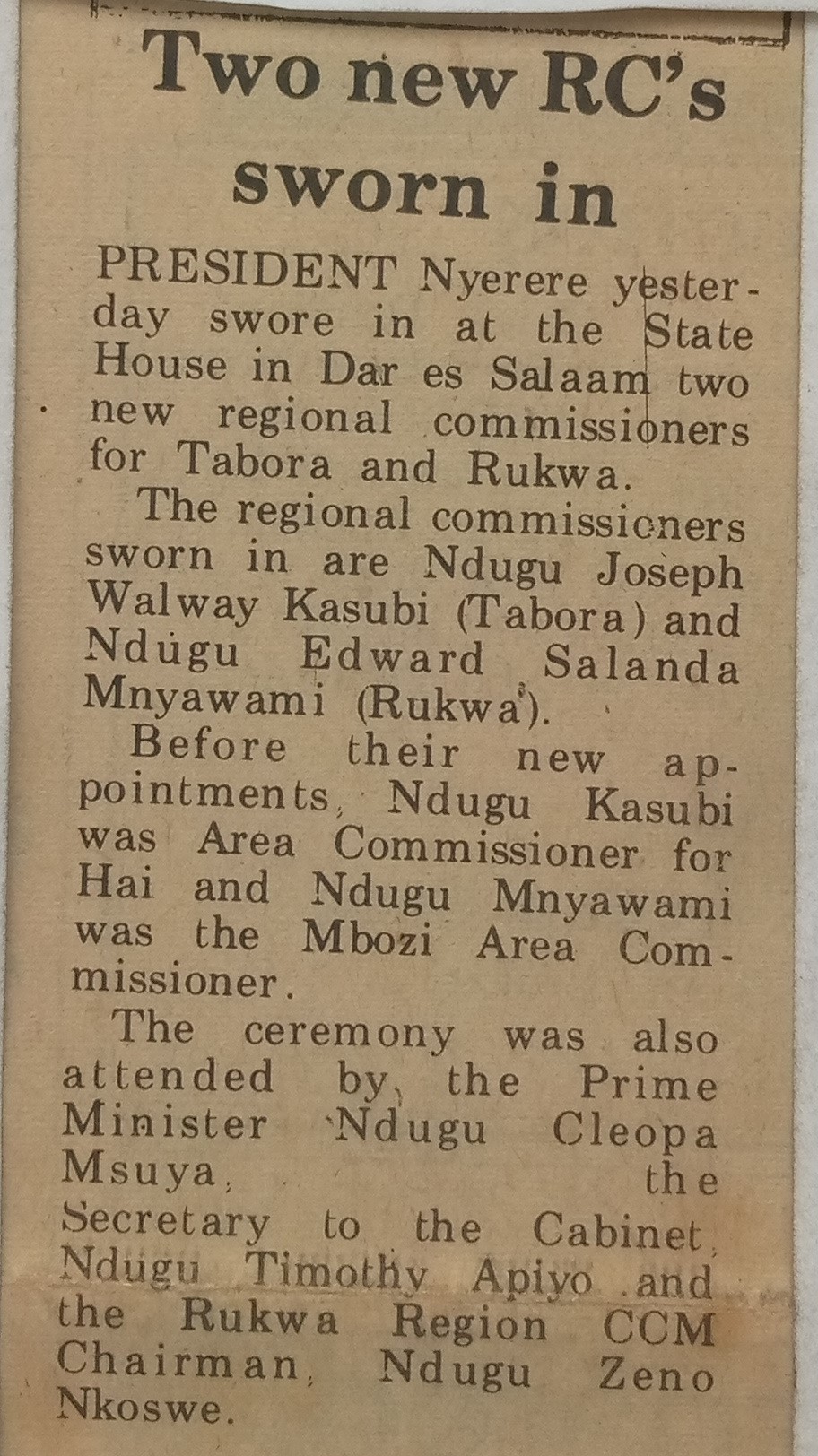 President Nyerere yesterday swore in at the State House in Dar es Salaam two new regional commissioners for Tabora and Rukwa.