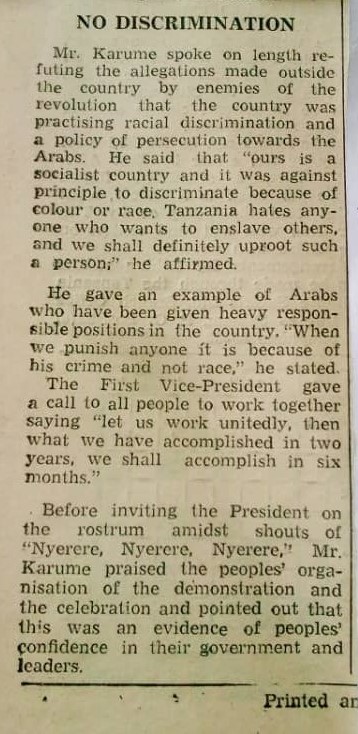 Mr. Karume spoke on length refuting the allegations made outside the country by enemies of the revolution that the country was practicing racial discrimination and policy of persecution towards the Arabs.