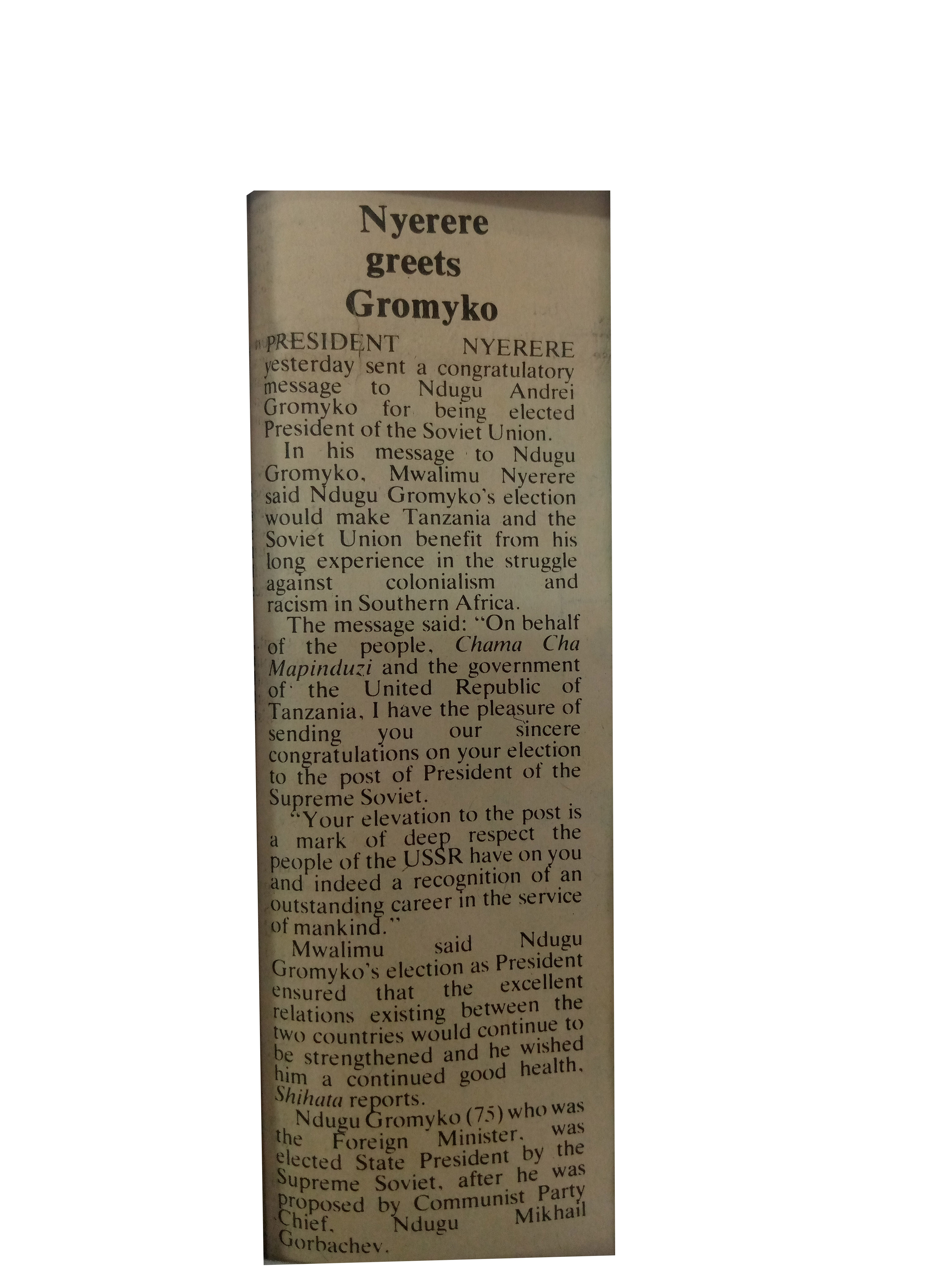 President Nyerere yesterday sent a congratulatory message to Ndugu Andrei Gromyko for being elected President of the Soviet Union