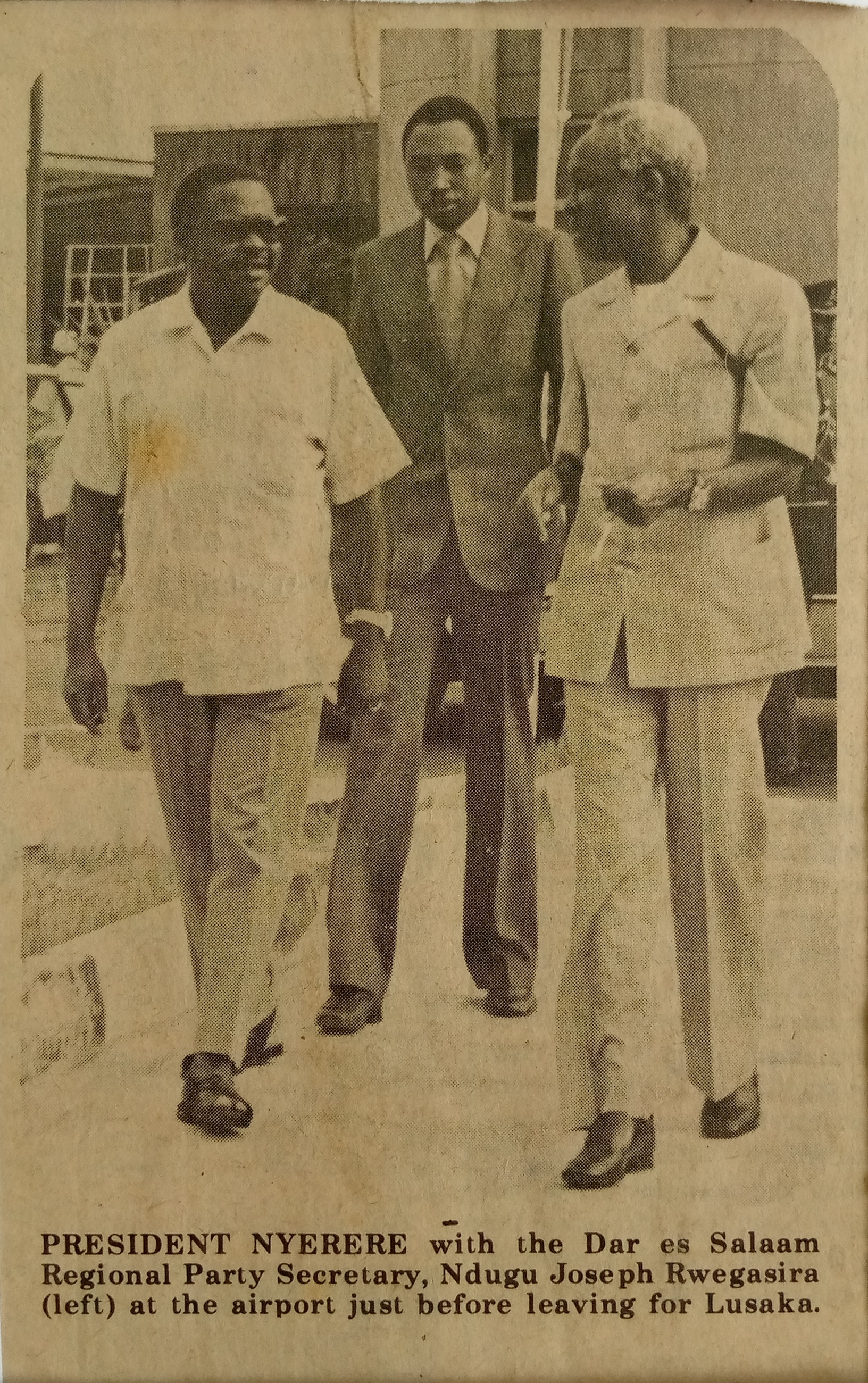President Nyerere with the Dar es Salaam regional secretary, ndugu Joseph Rwegasira at the airport just before leaving for Lusaka.