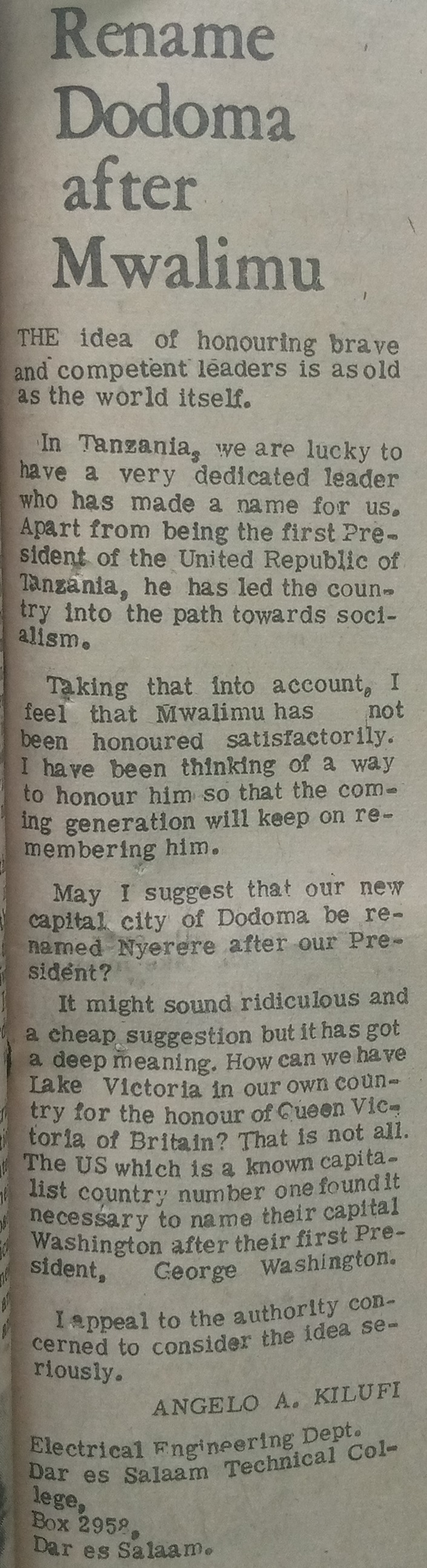 Nyerere, J.K. (1977) Rename Dodoma after Mwalimu