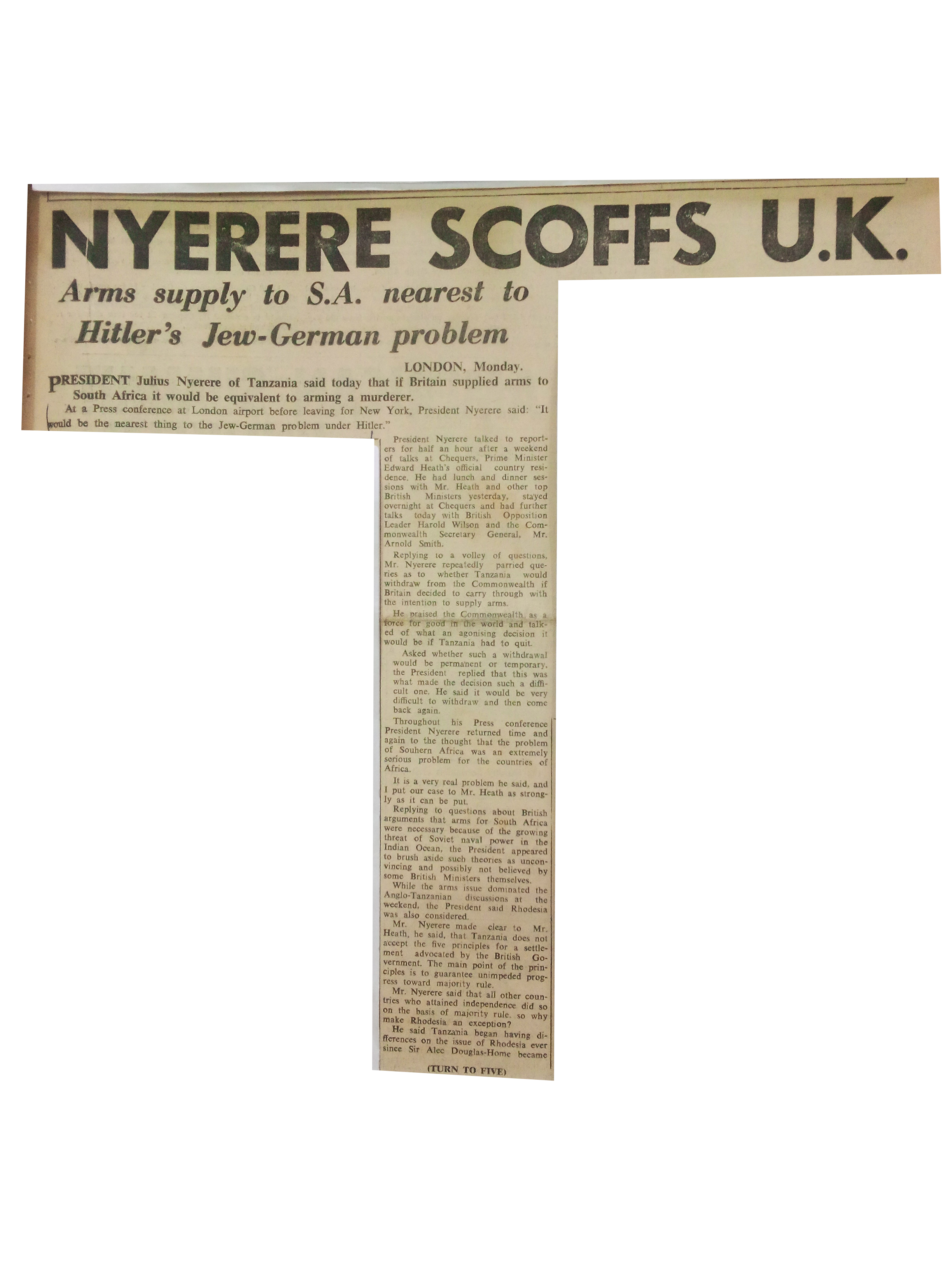 Nyerere Scoffs U.K: Arms supply to S.A nearest to Hitler's Jew-German problem (1970, October 13), The National