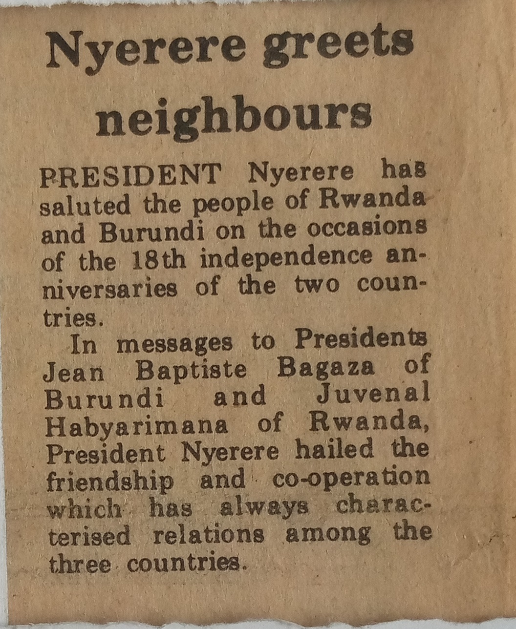 President Nyerere has saluted the people of Rwanda and Burundi on the occasions of the 18th independence anniversaries of the two countries.