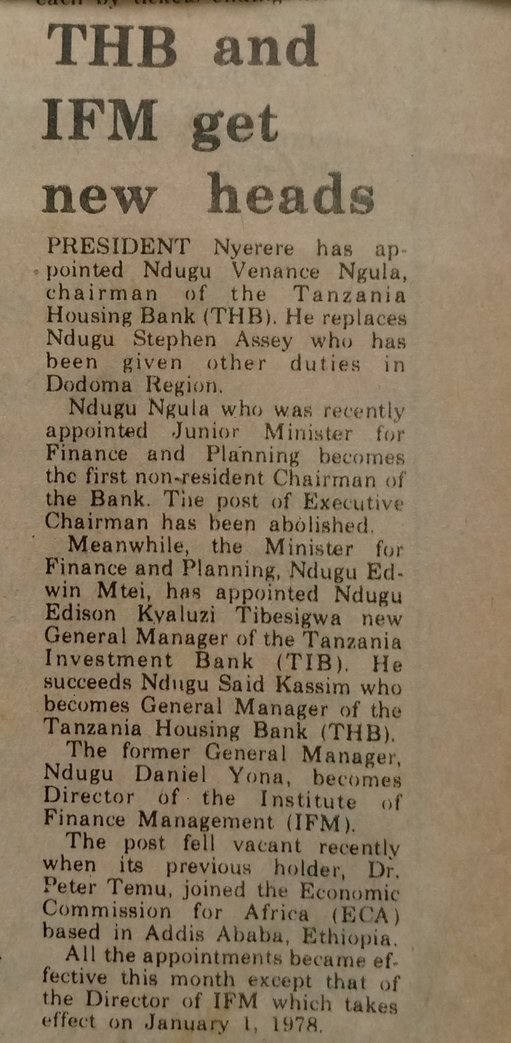 President Nyerere has appointed Ndugu Venance Ngula,chairman of the Tanzania Housing Bank(THB).He replaces Ndugu Stephen Assey who has been given other duties in Dodoma region.