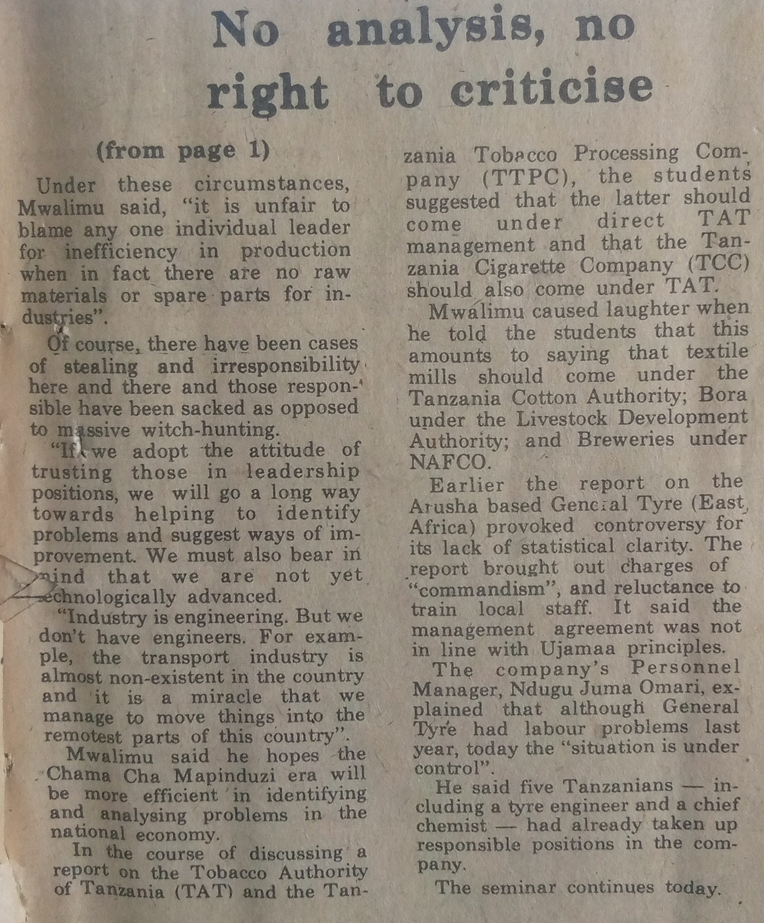 Under those circumstances, mwalimu said it is unfair to blame any one individual leader for inefficiency in production when in fact there are no raw materials or spare parts for in dustries.