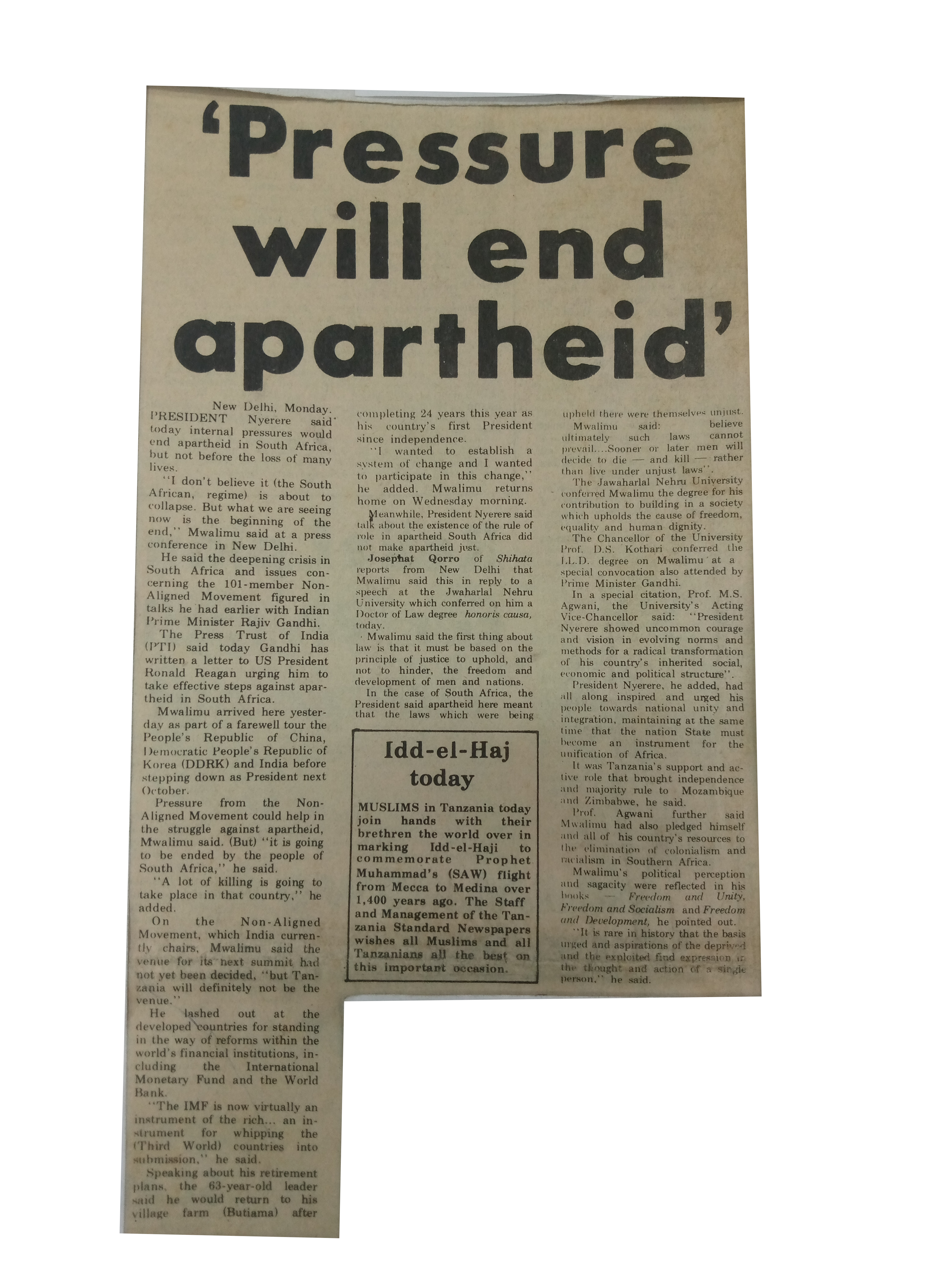 Pressure will end apartheid (1985, August 27). Daily News, pp.1