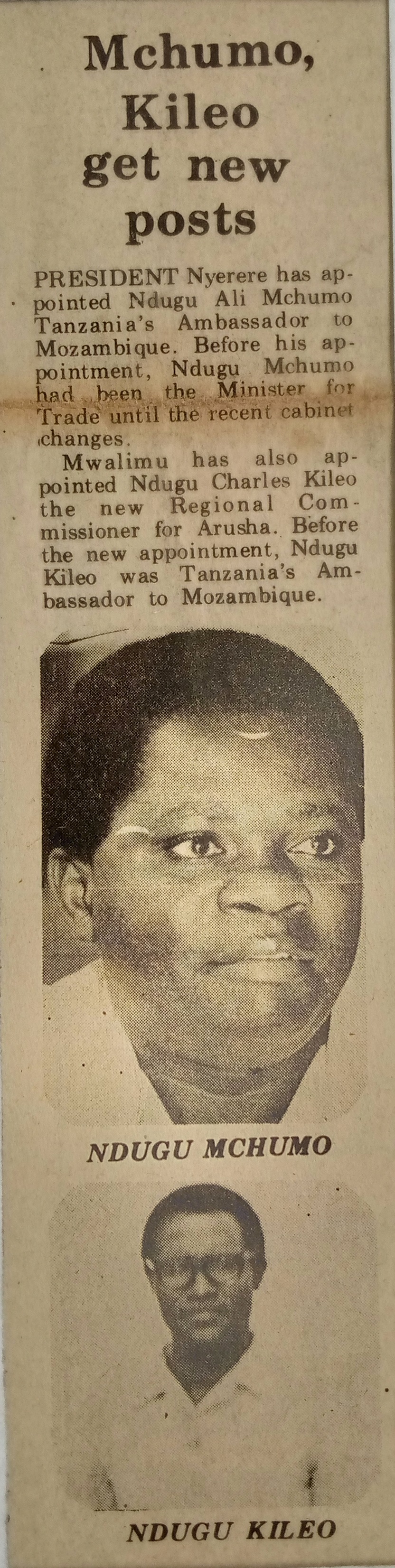 President Nyerere appointed Ali Mchumo Tanzanian ambassador to Mozambique and charles Kileo was appointed as a regional commissioner for Arusha.