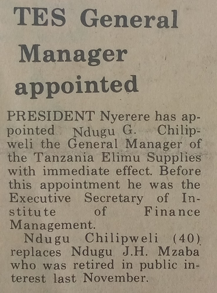 President Nyerere has appointed Ndugu G. Chilipweli the general manager of the Tanzania Elimu Supplies with immediate effect. Before this appointment he was the Executive secretary of Institute of Finance Management